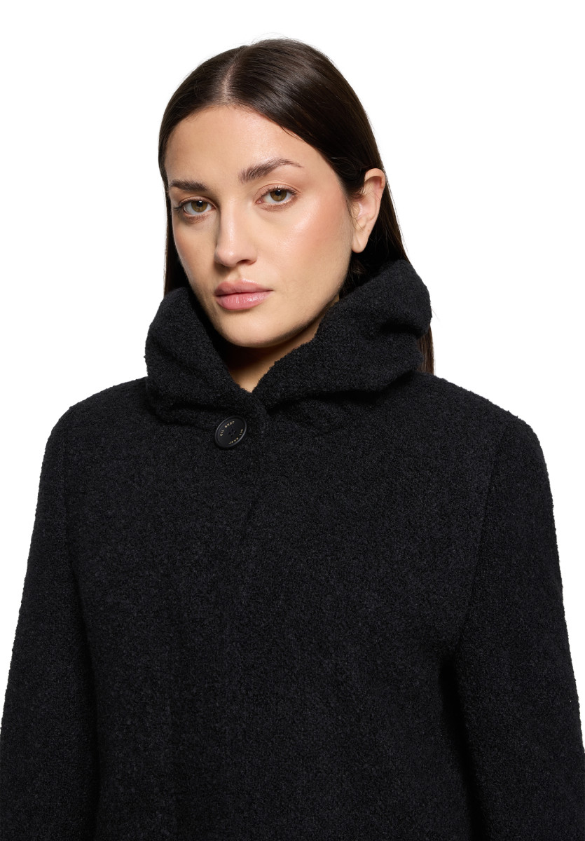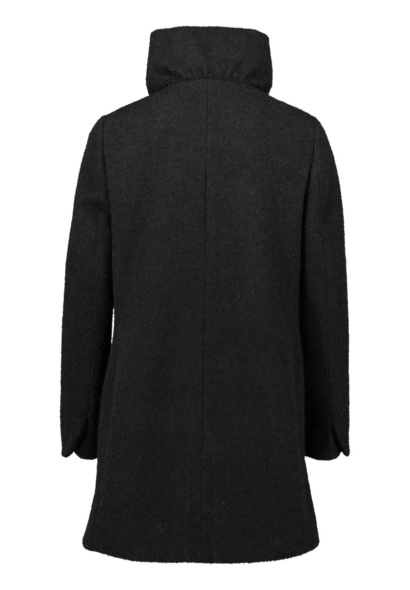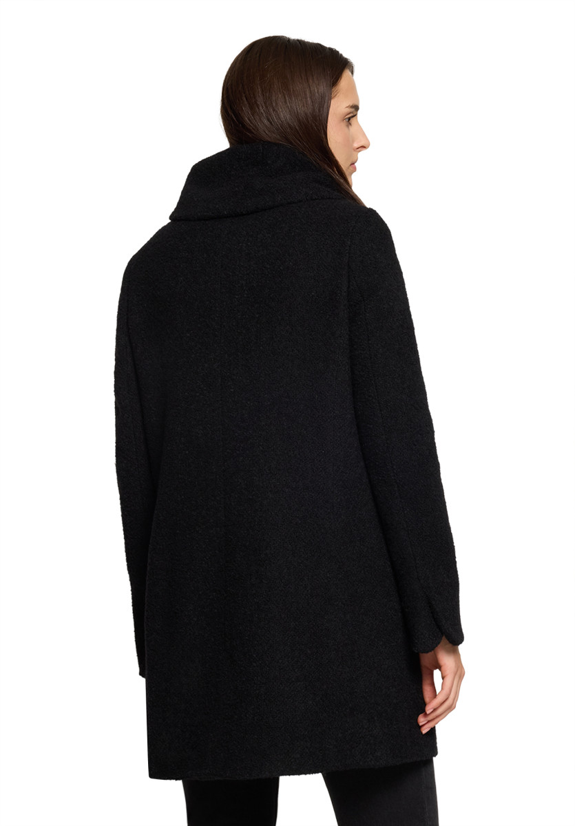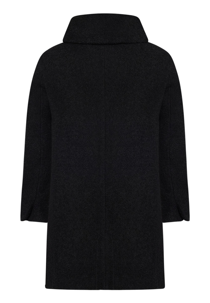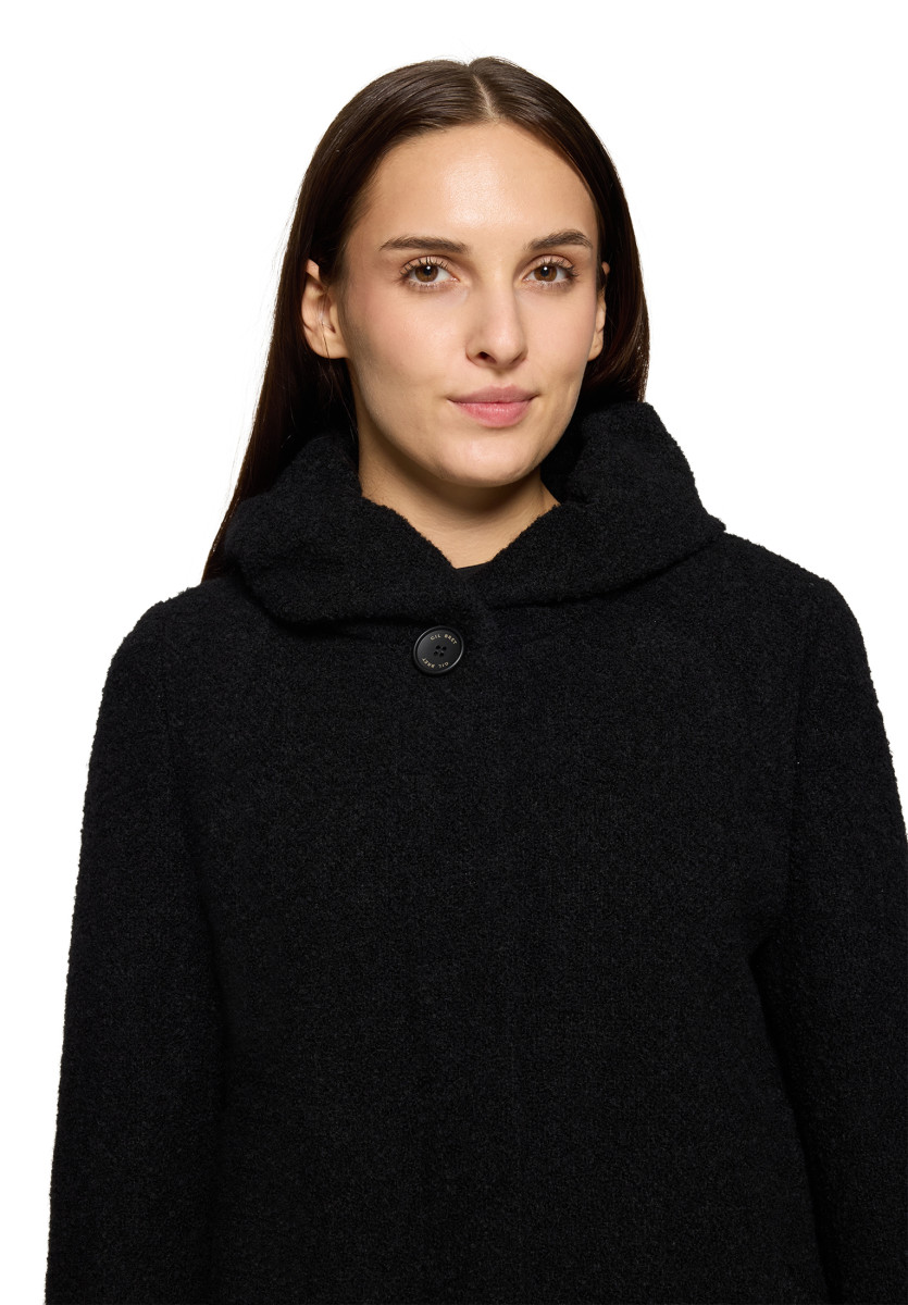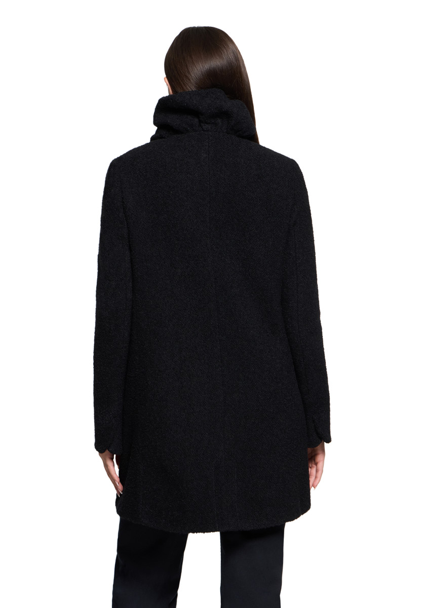 Der Mantel besticht durch seine Passform, die sich elegant vom Oberkörper nach unten hin ausstellt, und sorgt so für eine feminine, fließende Silhouette. Ein besonderer Blickfang ist der stilvolle Stehkragen mit gelegten Falten, der dem Design eine raffinierte Note verleiht. Die praktische Knopfleiste und die dezenten Eingrifftaschen machen den Mantel zum idealen Begleiter für den Alltag.