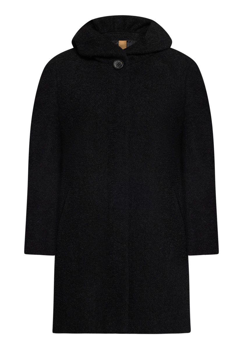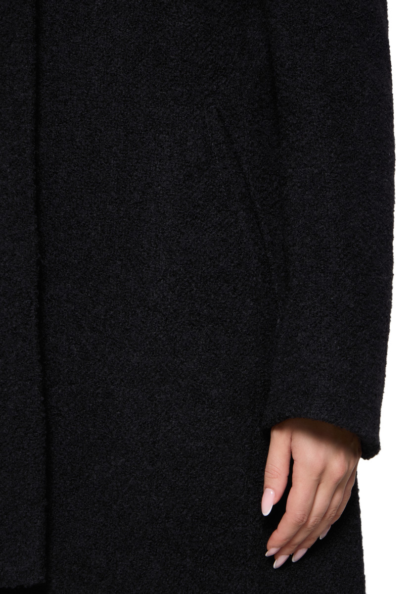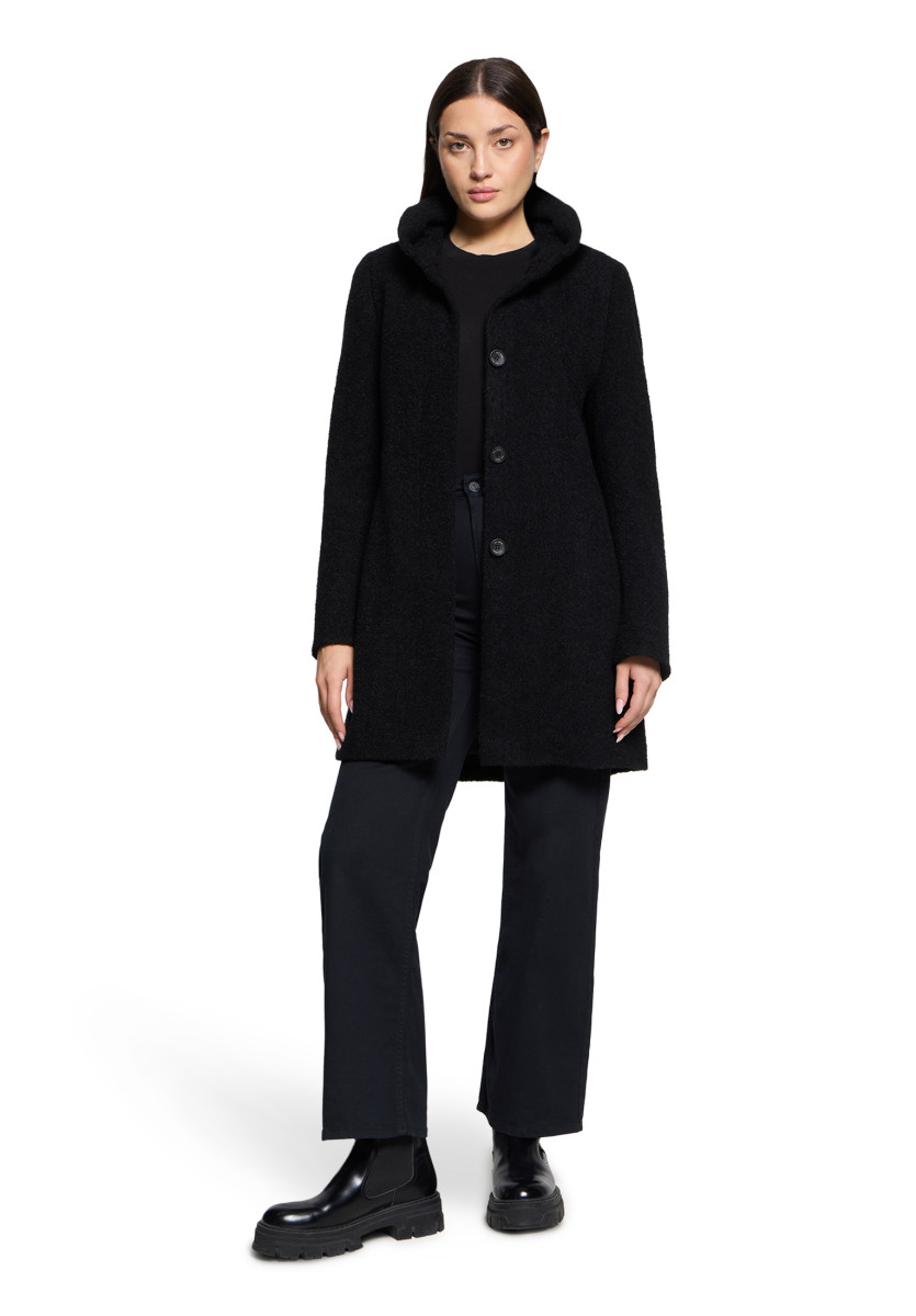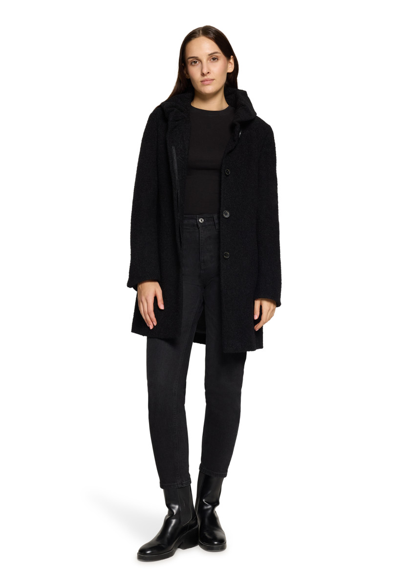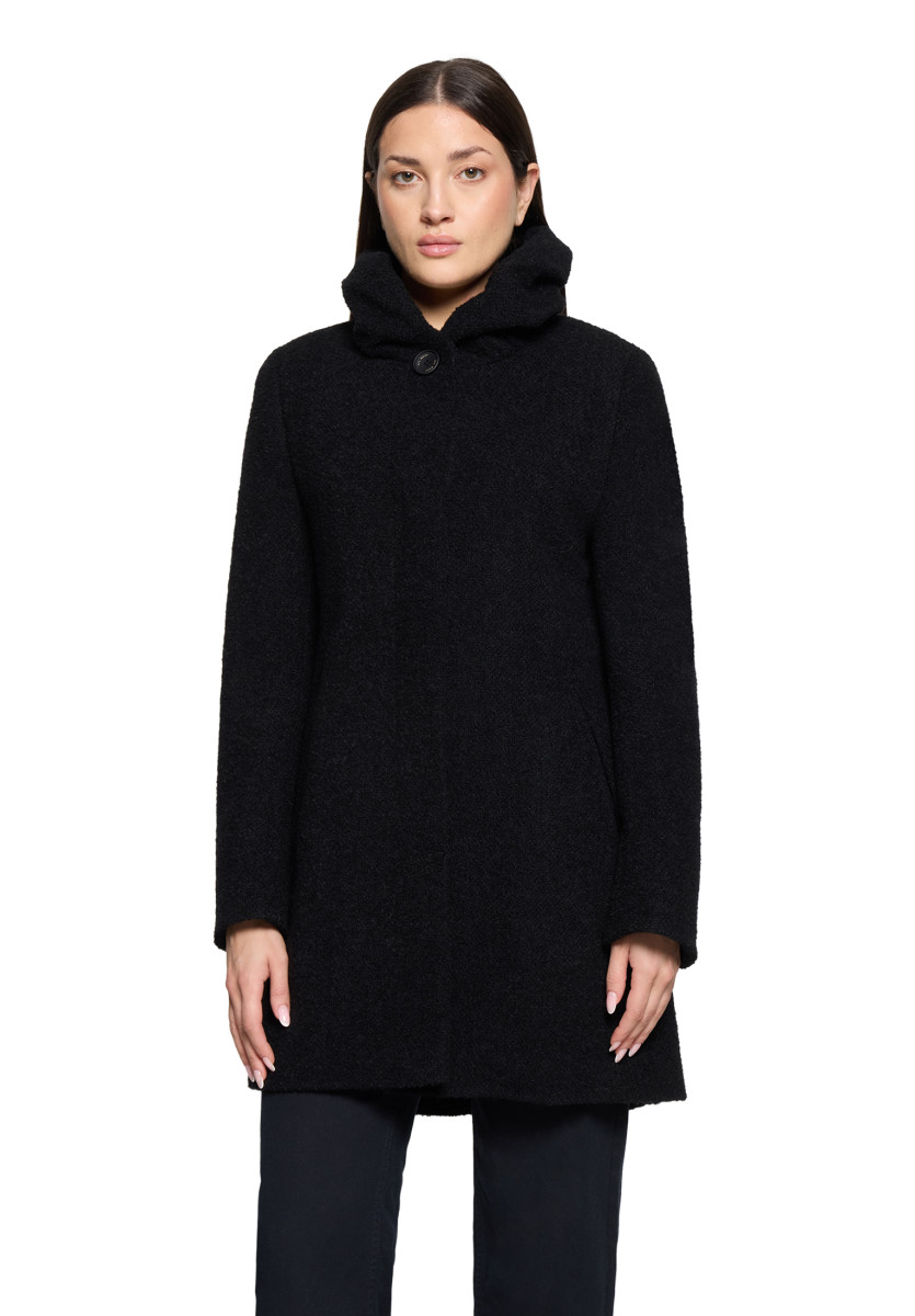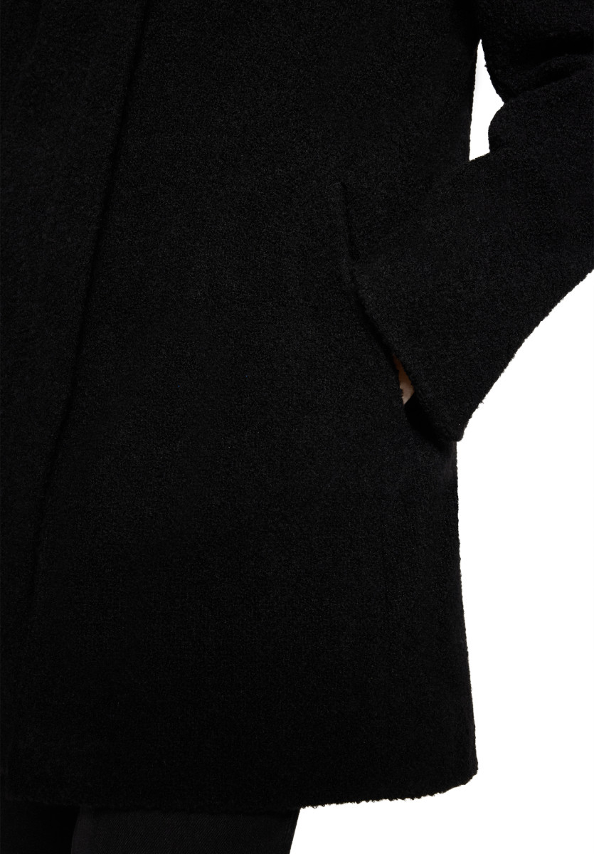 Der Mantel besticht durch seine Passform, die sich elegant vom Oberkörper nach unten hin ausstellt, und sorgt so für eine feminine, fließende Silhouette. Ein besonderer Blickfang ist der stilvolle Stehkragen mit gelegten Falten, der dem Design eine raffinierte Note verleiht. Die praktische Knopfleiste und die dezenten Eingrifftaschen machen den Mantel zum idealen Begleiter für den Alltag.