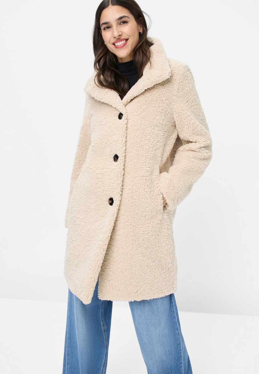 Dieser warmes Damen-Teddy-Mantel in beigem Farbton ist der ideale Begleiter für kühle Tage. Der kuschelige Fleece-Stoff sorgt für eine angenehme Wärme und ein besonders weiches Tragegefühl. Der hochgeschlossene Stehkragen bietet zusätzlichen Schutz vor Wind und Kälte, während die großen Knöpfe vorne dem Mantel einen klassischen, eleganten Look verleihen.