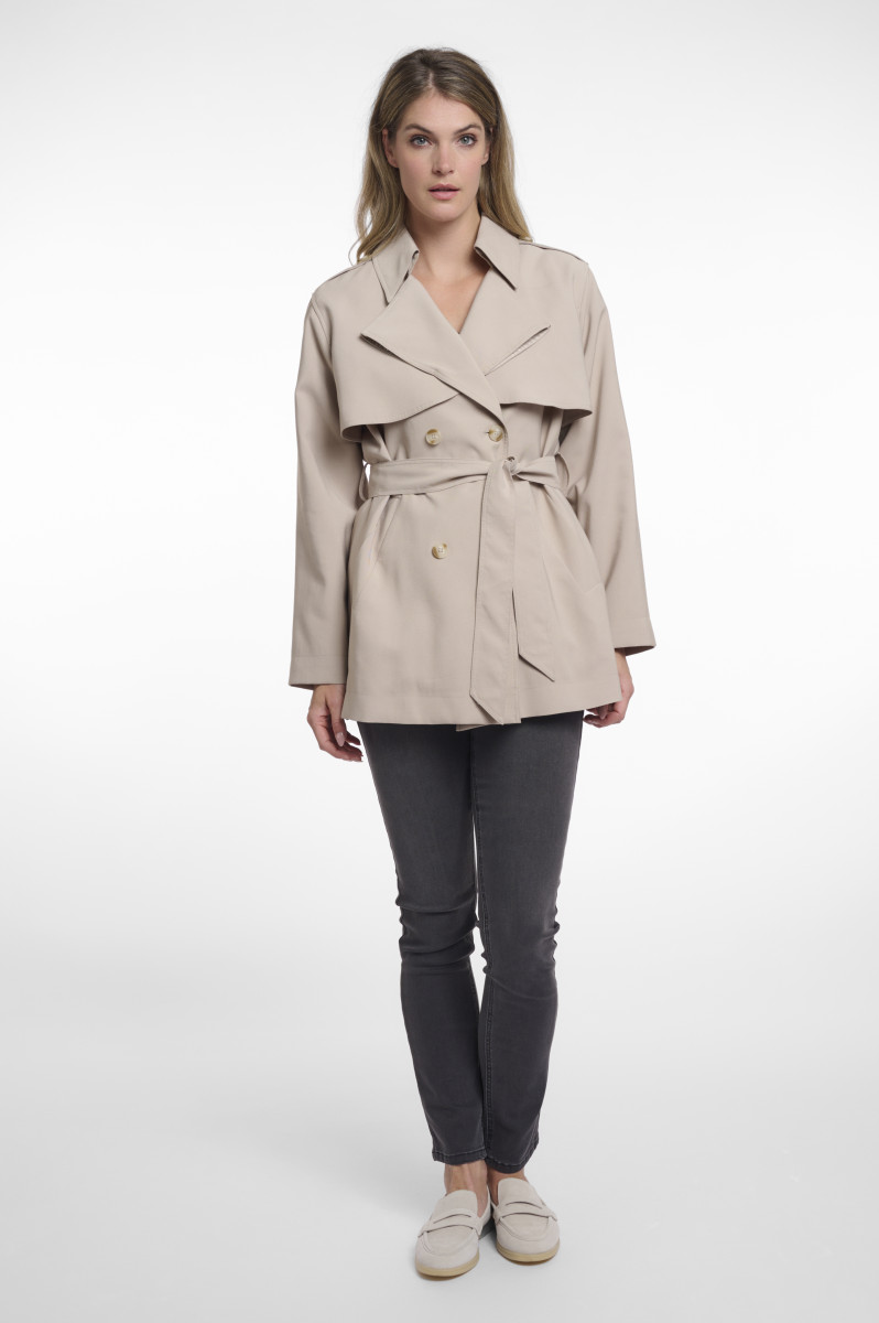 Dieser kurze, doppelreihige Trenchcoat ist eine vielseitige und stilvolle Wahl für jede Gelegenheit. Dieses unverzichtbare Stück verfügt über einen Knopfverschluss, einen abnehmbaren Taillengürtel, seitliche Schlitztaschen sowie Sturmklappen vorne und hinten. Mit diesem unverzichtbaren Trenchcoat bleiben Sie mühelos schick und elegant.