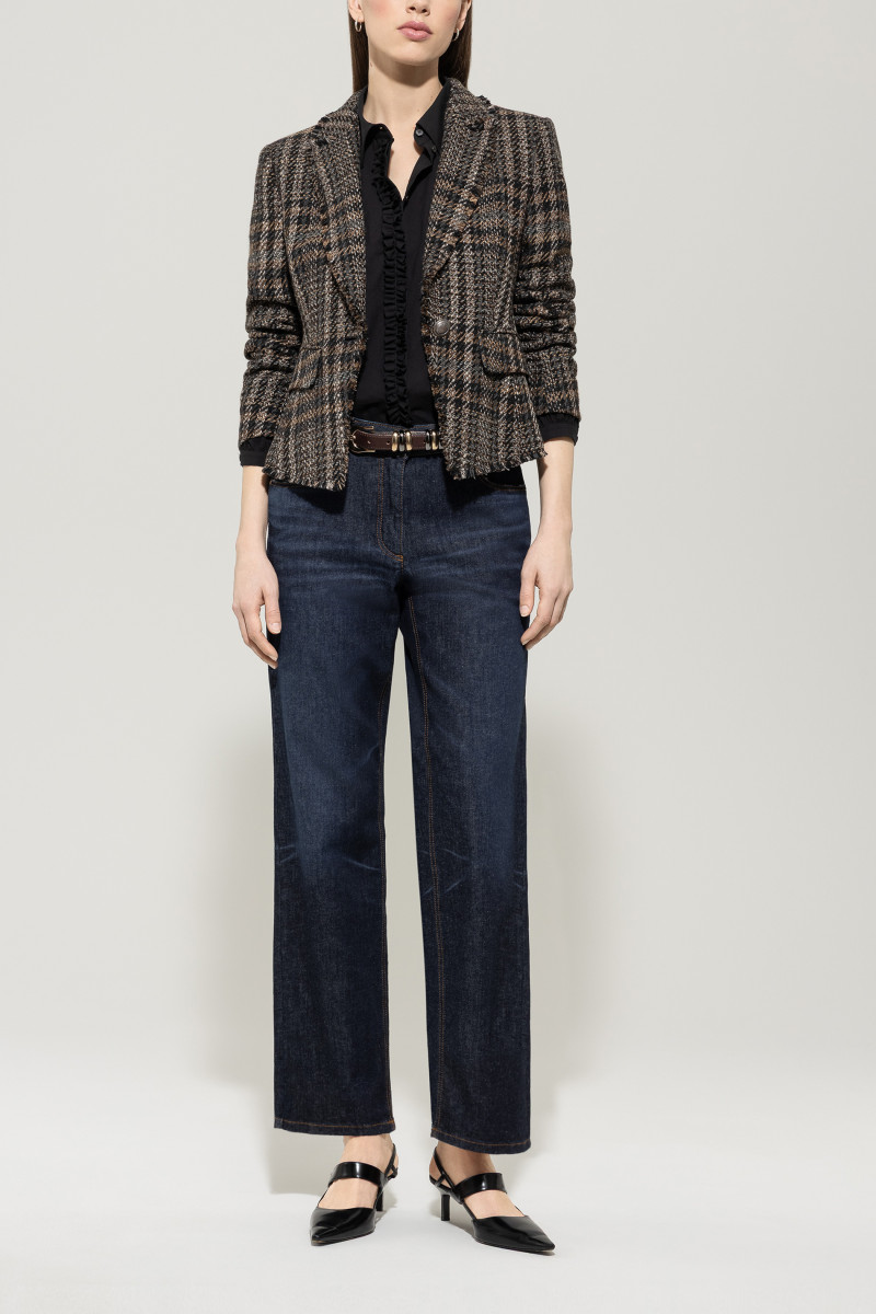 Kurzer, taillierter Ein-Knopf-Blazer aus weicher Wollmischung mit Karo-Dessin und Schulterpolsterung. Der gefütterte Blazer ist offenkantig verarbeitet und hat zwei aufgesetzte Pattentaschen. Unser Model ist 178 cm groß und trägt Größe 36. Obermaterial: 34% Polyester, 26% Wolle. 22% Polyacryl, 12% Schurwolle, 4% Polyamid, 2% Sonstige Fasern Futter: 57% Viskose, 43% Polyester Chemische Reinigung