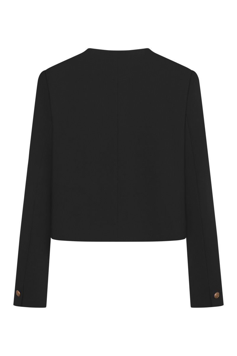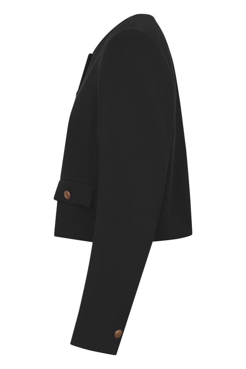 Modell: Kurzer Blazer Mit Knöpfen geschlossen im Vorderteil Rundhals Vorderteil mit Pattentaschen und Knopf Ärmelabschluss mit Knopf Artikel: Weicher, fließender Stoff Leicht strukturierte Oberfläche Querelastisch Gesamtlänge: 50 cm