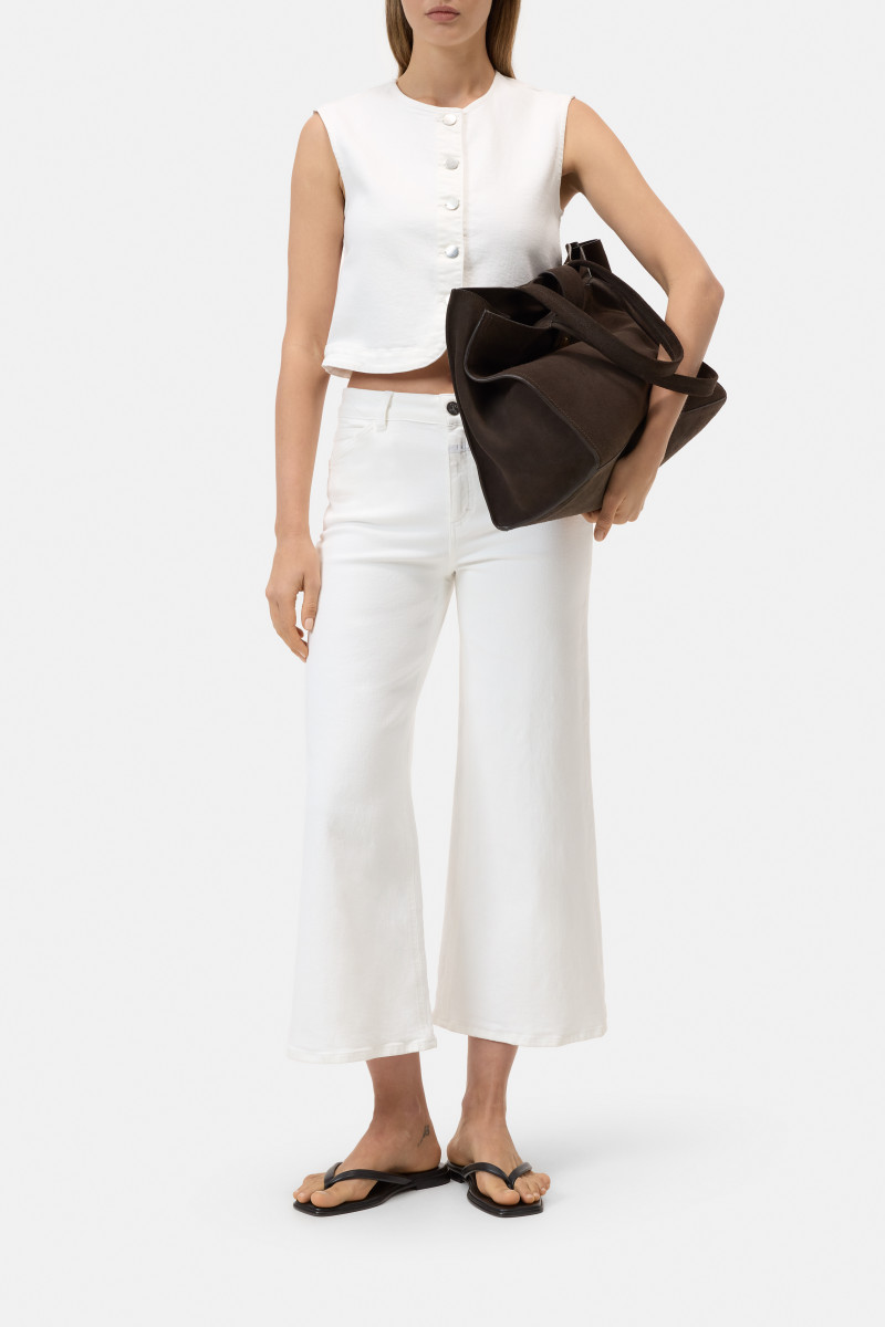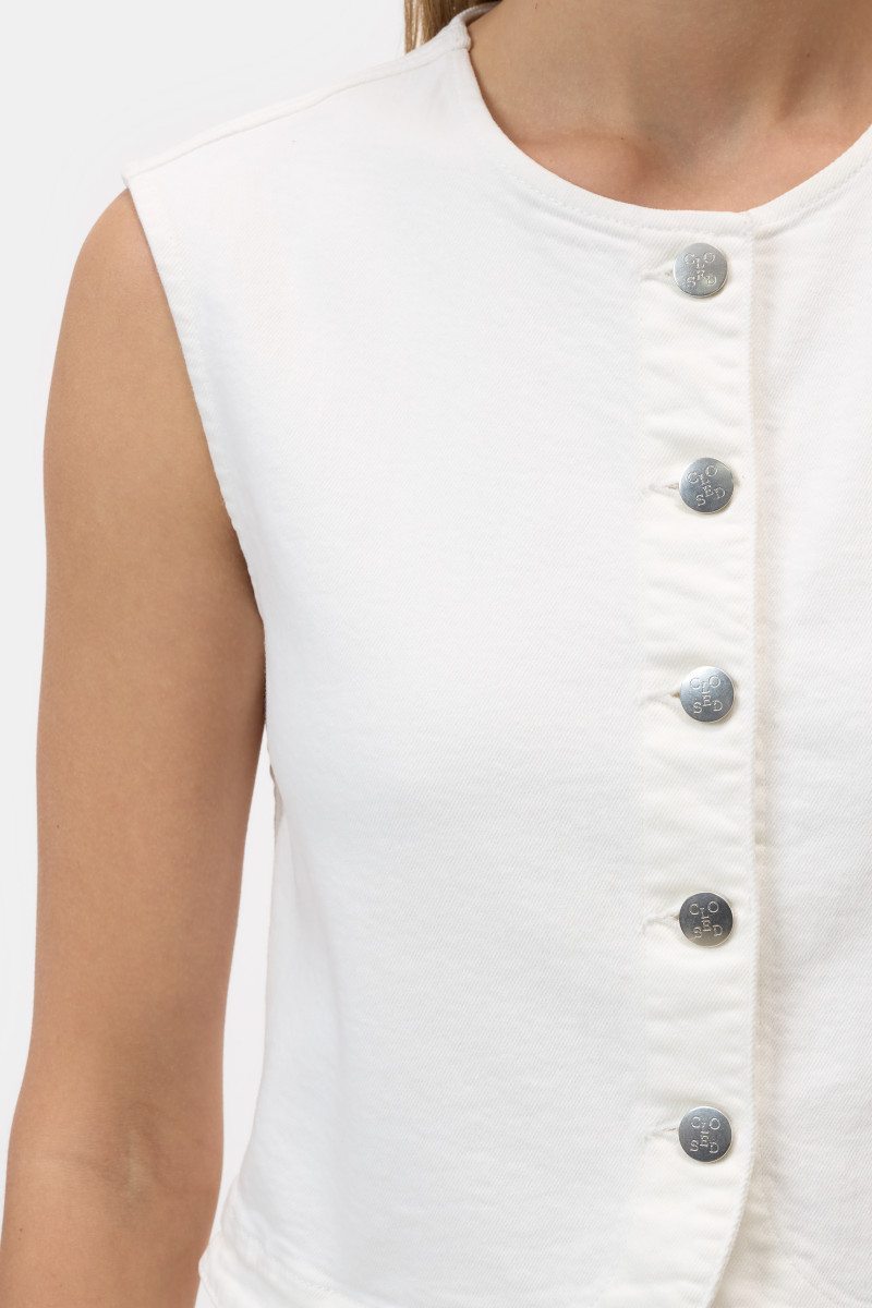 Die Weste aus 12 oz Denim hat eine reguläre Passform mit abgerundetem Saum. Die Knopfleiste mit silbernen Monogramm-Knöpfen rundet die Premium-Qualität ab. Hergestellt in Italien.