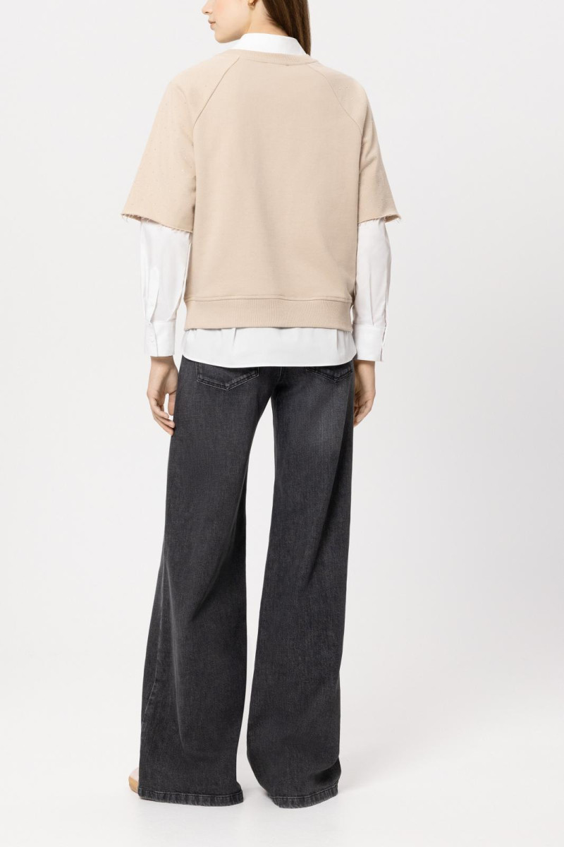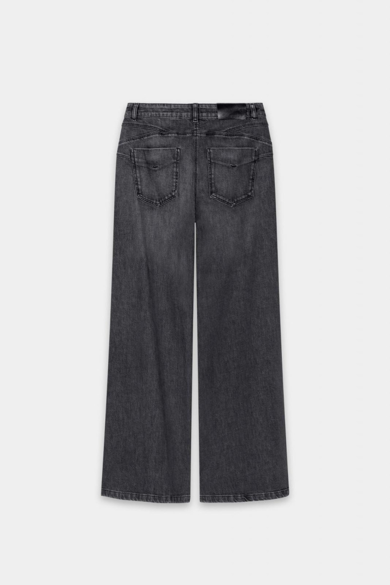 Ausgestellte Jeans in Stretch-Qualität mit betont weitem Bein. Unter dem Bund sind dekorative Pattentaschen mit Schmuckknöpfen angebracht.