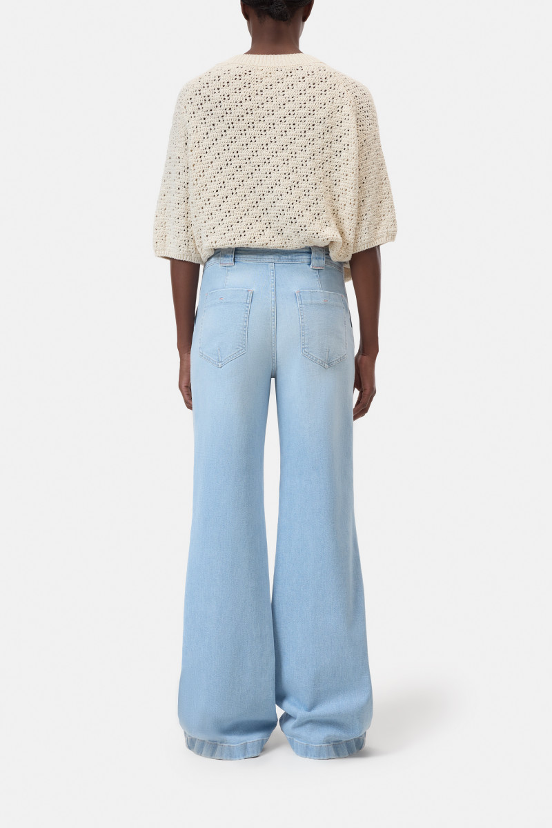 Die Aria Jeans kombiniert nachhaltige Innovation mit modernem Design. Gefertigt aus blauem Super-Stretch-Denim, überzeugt sie durch eine ausgestellte Passform mit hoher Leibhöhe und langem Bein. Der hellblaue Vintage-Wash mit leichtem Scraping sorgt für einen authentischen Look, während das pinke Fly Label einen markanten Akzent setzt. Nachhaltig produziert mit BCI-Baumwolle, Indigo-Flow-Färbetechnik, pflanzlicher Appretur und vorreduziertem Indigo – made in Italy.