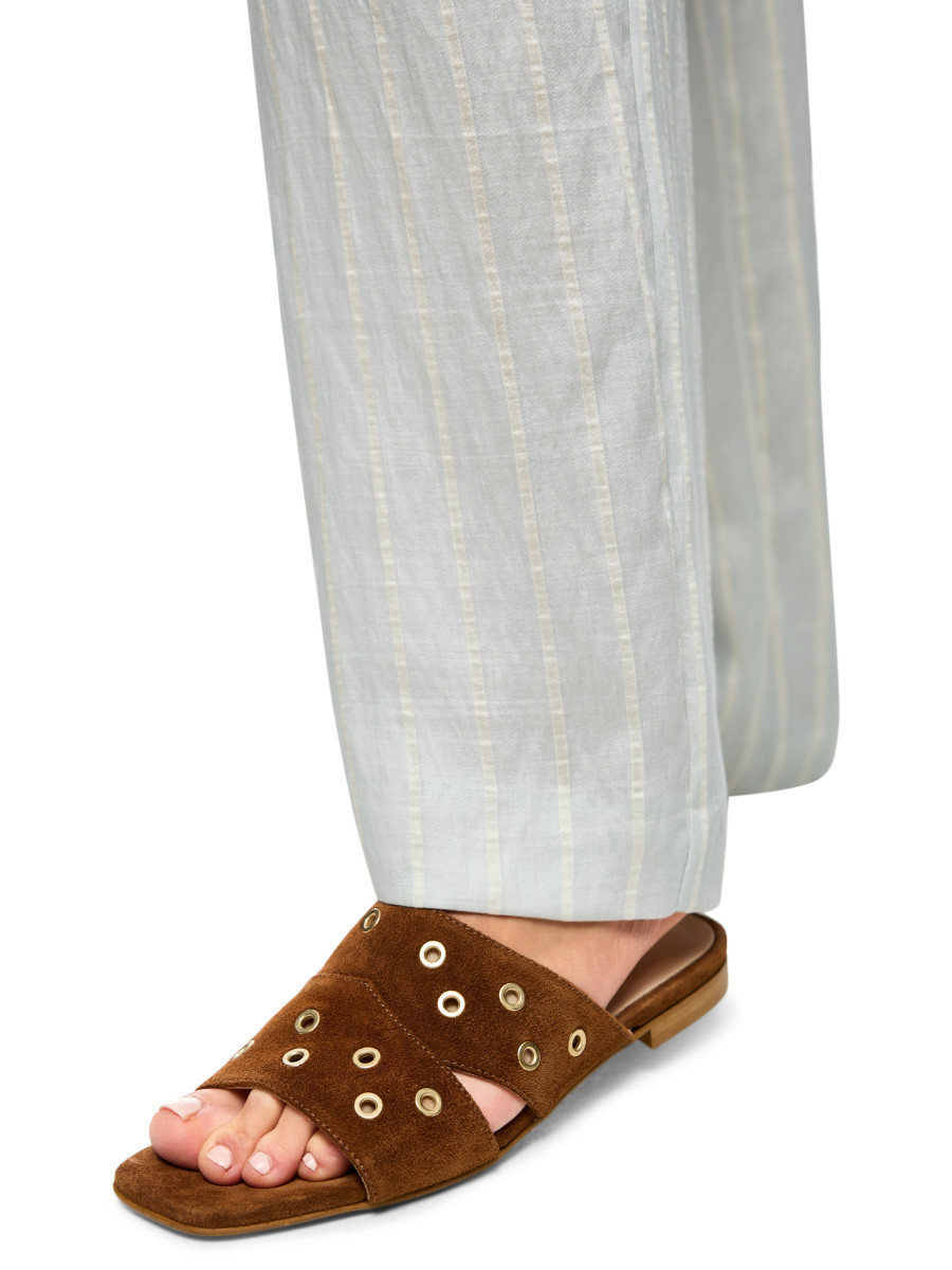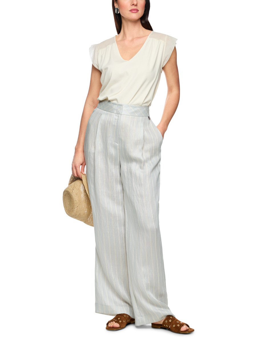 Die Damenhose WICHITA überzeugt mit weich fließendem Lyocell-Stretch und einer modernen Streifenoptik, die vielseitig kombinierbar ist. Bundfalten, der hohe Bund sowie das weite Bein mit schräg stehenden Eingrifftaschen sorgen für eine elegante Silhouette und Komfort, während zwei Haken und ein Reißverschluss für einen sicheren Sitz sorgen. Der weite Schnitt und die Flügeltaschen machen die Hose zum vielseitigen Begleiter für Alltag und Freizeit.Lief.-Art-Nr: AP 81.61 W27