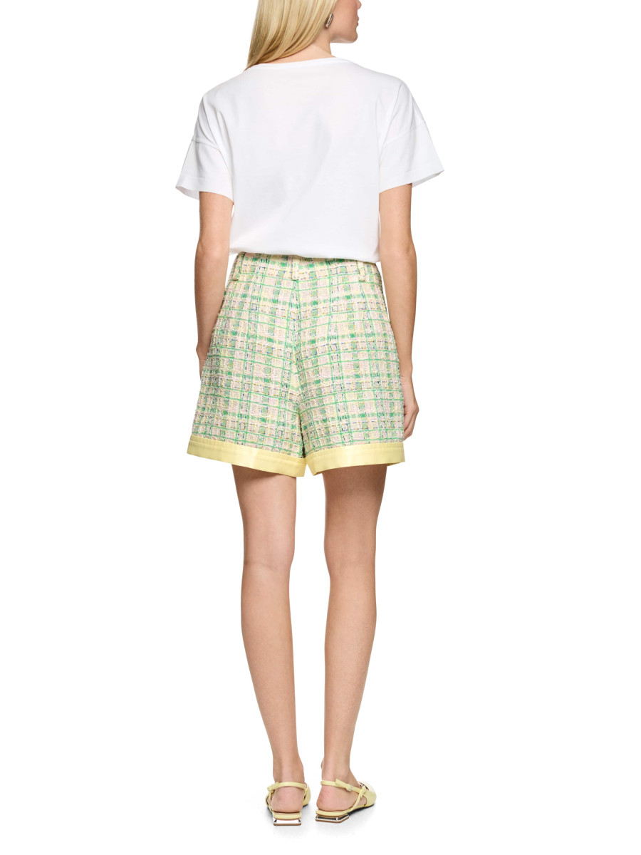 Stylische Shorts mit mehrfarbigem Strukturmuster und unifarbenen Details für einen modernen Kontrast. Schräg stehende Eingrifftaschen, Knopf- und Reißverschluss sorgen für eine bequeme Passform. Perfekt für trendbewusste Sommer-Looks.