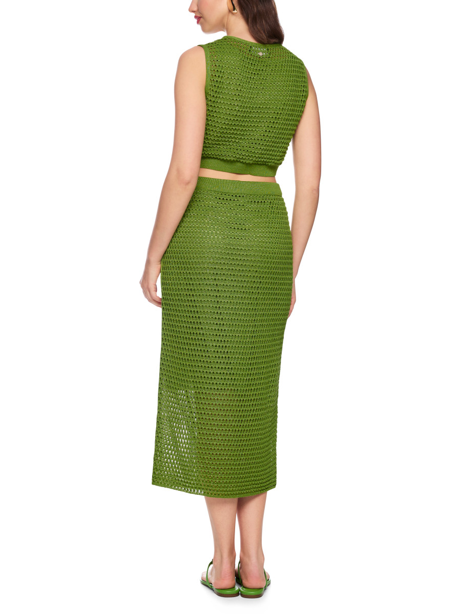 Das Ajourkleid Rethink Together präsentiert sich in einem körperbetonten Schnitt mit seitlichen und rückseitigen Cut-outs und einem vorne an das Rockteil angenähten Oberteil. Ein Gummizug in der Taille sorgt für optimalen Sitz, während das ärmellose, tonal gefütterte Design einen modernen und zugleich eleganten Look vermittelt. Das Modell trägt das Nachhaltigkeitslabel "Rethink Together" und wurde in Deutschland verstrickt und veredelt.Lief.-Art-Nr: AC 21.56 M25