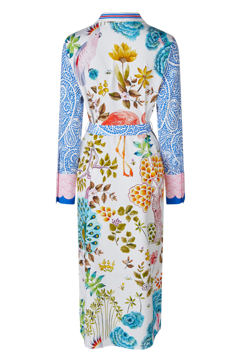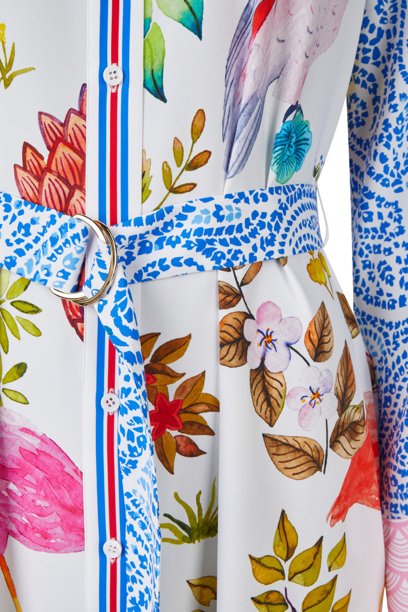 Hemdkragen | Langarm | Durchgehende Knopfleiste | Bindegürtel | Lebendiger Allover-Print | Maxi-Länge | Aus Seide