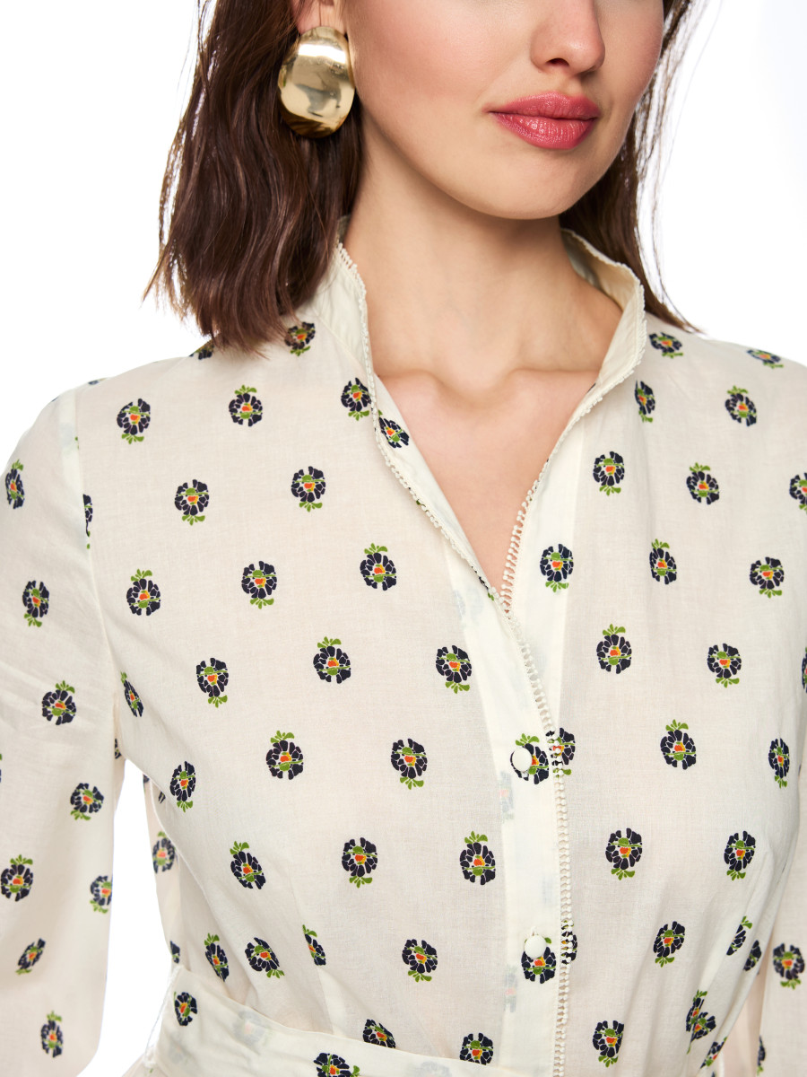 Leichtes Maxikleid aus reiner Baumwolle mit zartem Blumenprint. Das ausgestellte Rockteil, der Bindegürtel zur Taillenbetonung sowie die Lochmuster- und Spitzendetails unterstreichen den femininen Look. Ein kleiner Stehkragen, die durchgängige Knopfleiste und kontrastfarbige Kanten runden das Design ab.