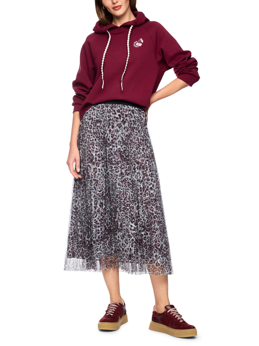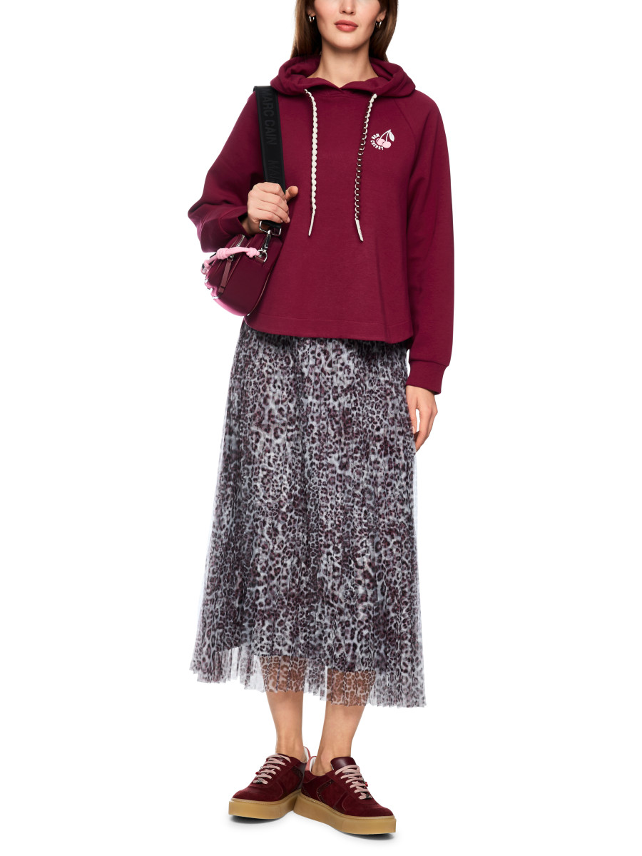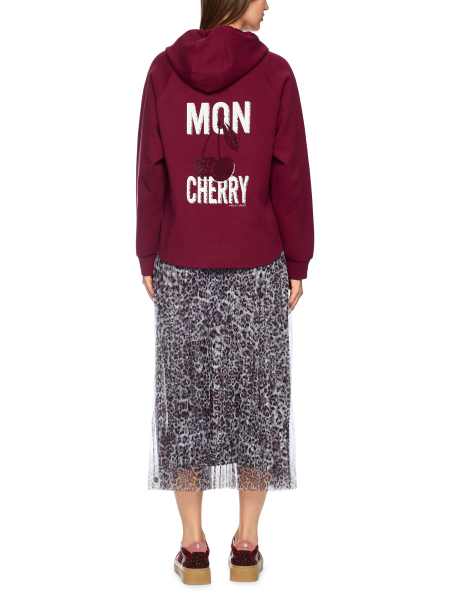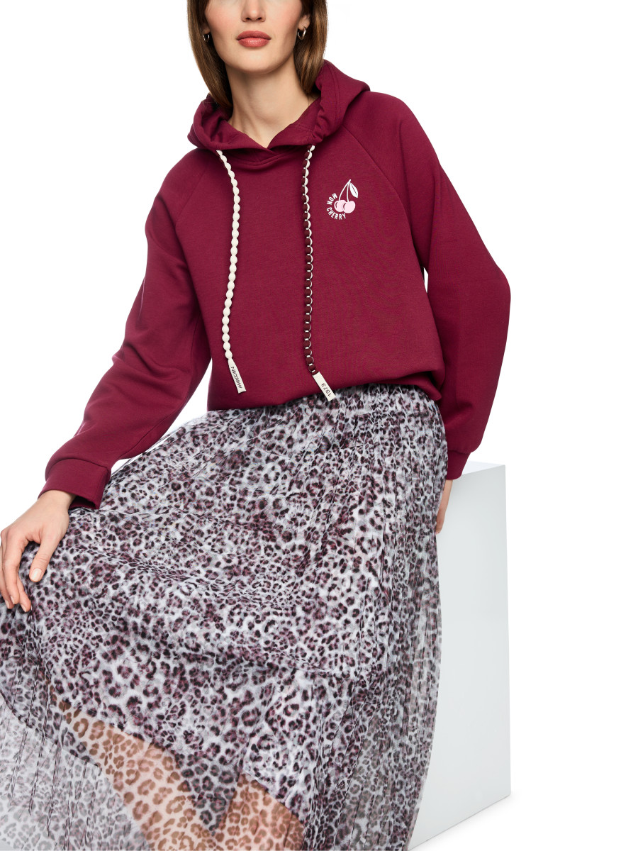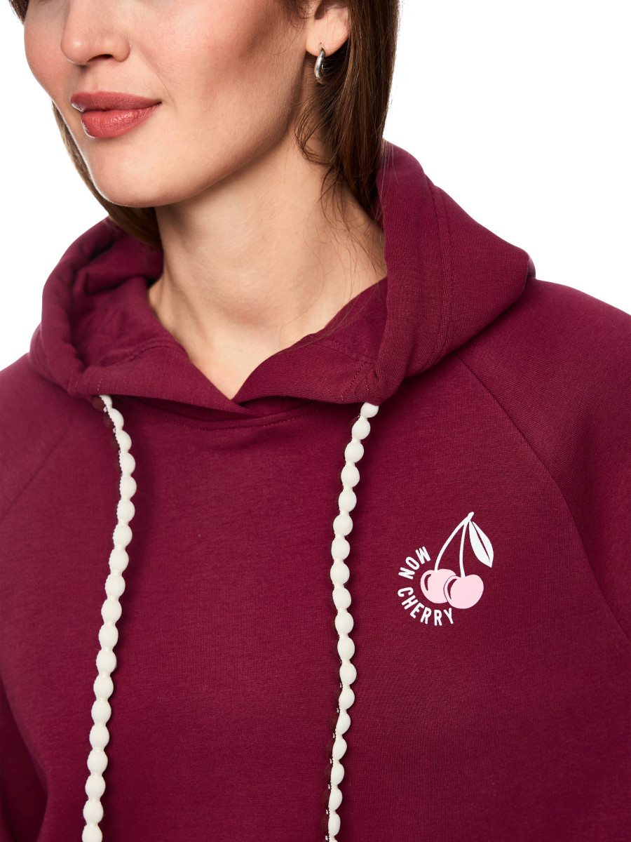 Lässiger Hoodie mit entspanntem Schnitt und modernem Aufdruck. Das Sweatshirt kommt mit praktischer Kapuze, Raglanärmeln und leicht abgerundetem Saum. Der Cherry Aufdruck befindet sich auf der Vorderseite in klein und auf der Rückseite in der großen Variante mit Strasssteinen. Weiteres Detail ist der Kordelzug, der zweifarbig und in runder Form designt ist.