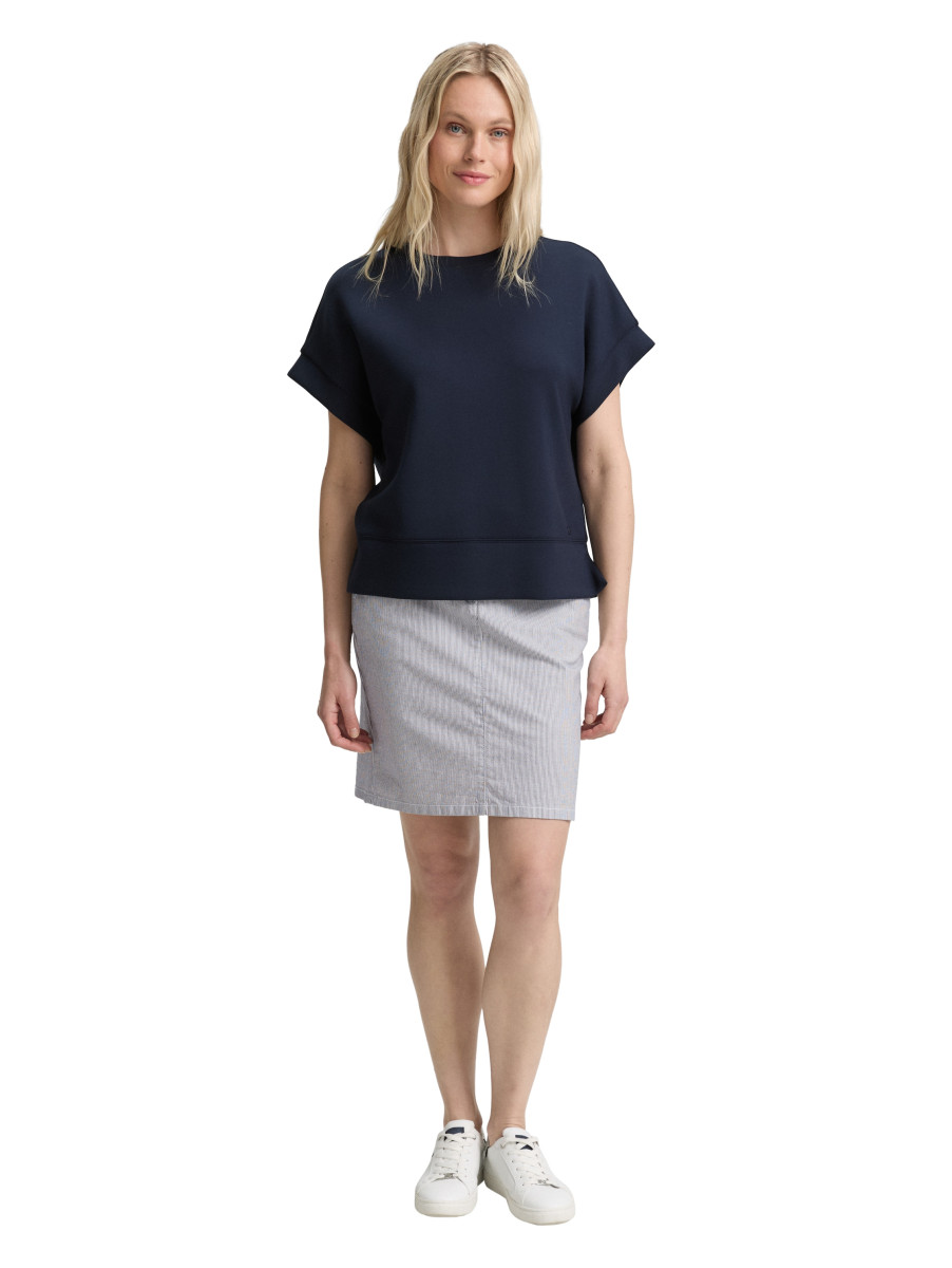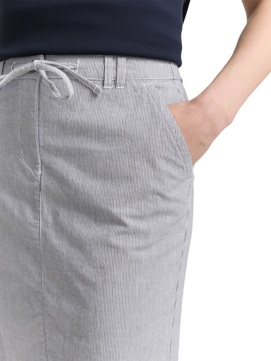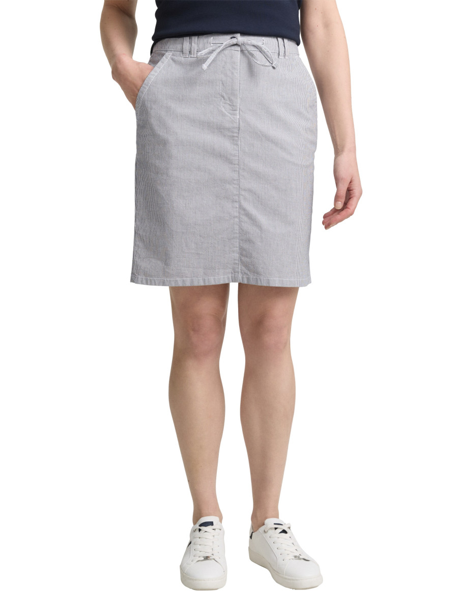 Chino Rock mit dezentem Streifenmuster. Mit Kordelzug, seitlichen Eingriffstaschen auf der Vorderseite und Fake-Taschen auf der Rückseite. Mit kurzem Schlitz hinten am Saum für mehr Bewegungsfreiheit.