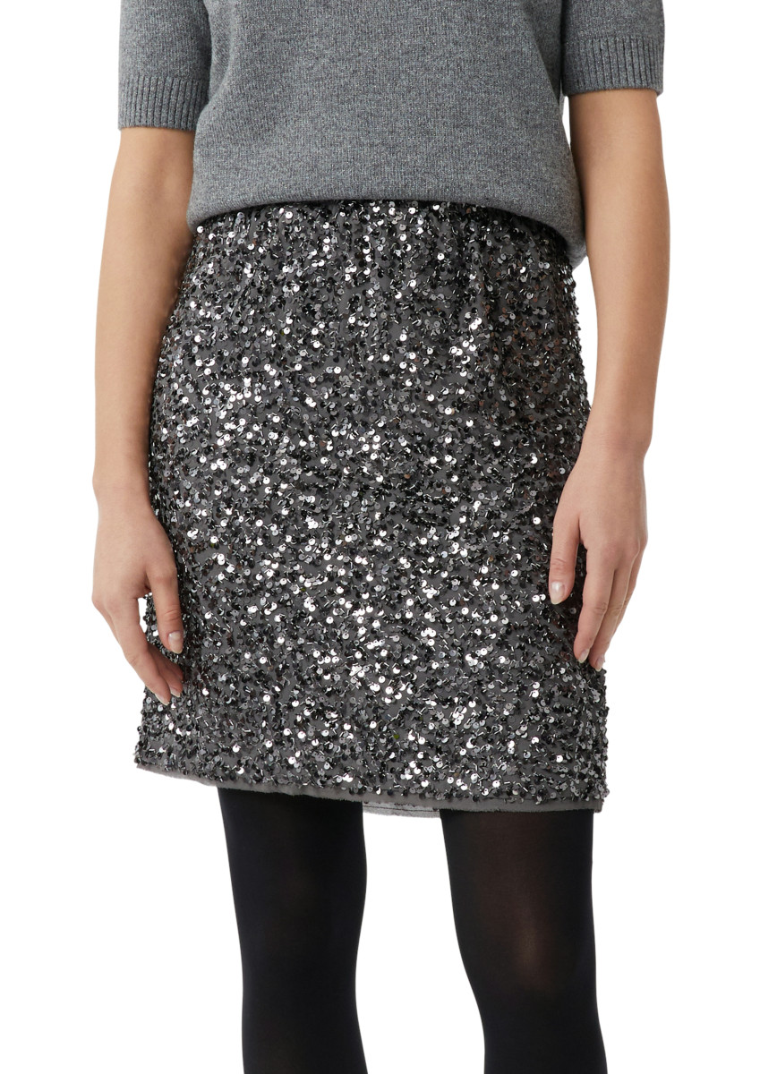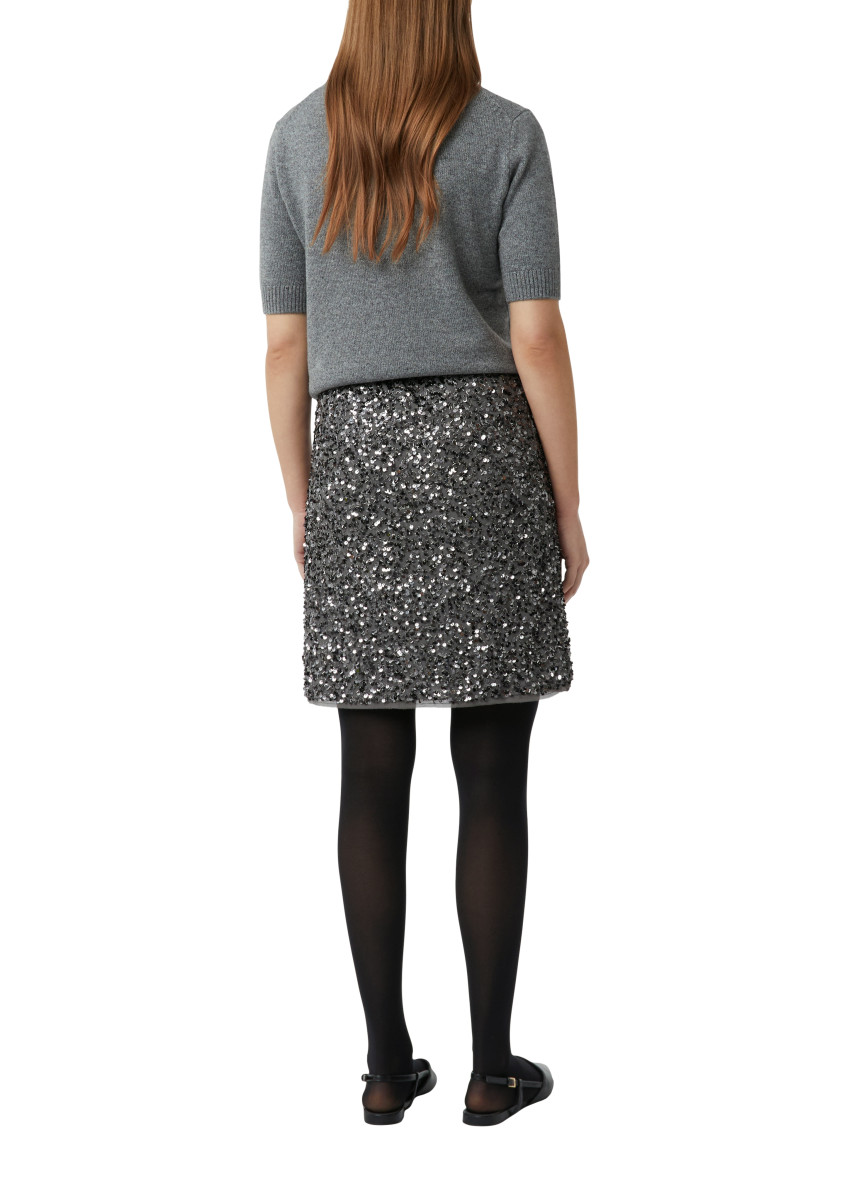 Das gesamte Kleidungsstück ist über und über mit unzähligen, funkelnden Pailletten besetzt, die bei jeder Bewegung ein faszinierendes Lichtspiel erzeugen. Die eng anliegende, gerade geschnittene Form des Minirocks schmeichelt der Figur und betont die Beine. Er ist ideal, um jedem Outfit sofort einen Hauch von Glamour und Extravaganz zu verleihen. Dank des schlichten Schnitts rückt das aufwendige Material vollständig in den Mittelpunkt. Kombiniert mit schlichten Oberteilen wie einem einfachen Seidentop oder einem feingestrickten Pullover, wird dieser Rock zum Highlight des Abends. Ein Statement-Piece, das für unvergessliche Momente sorgt.