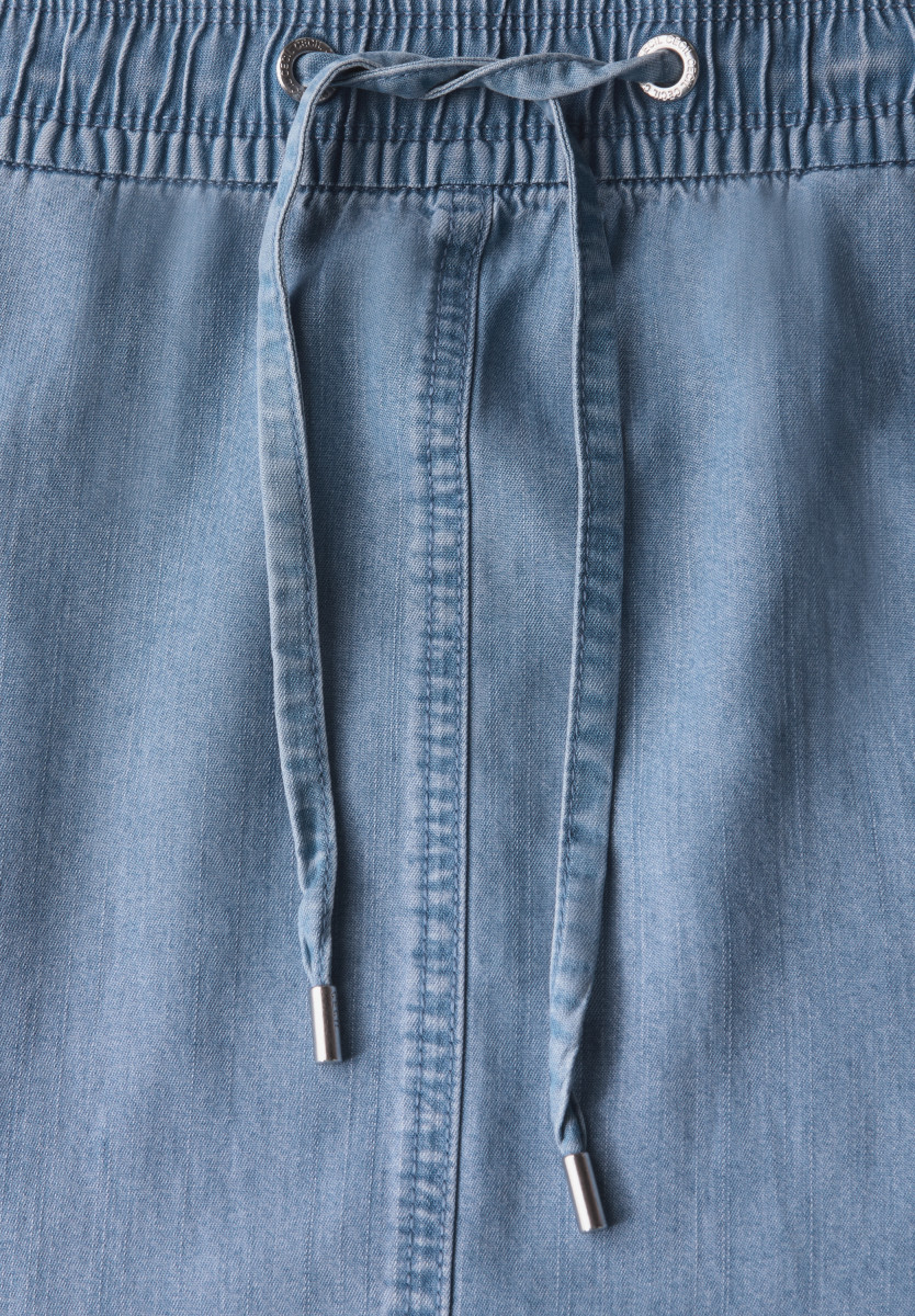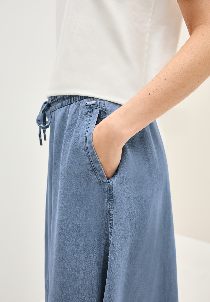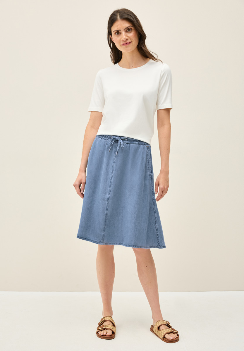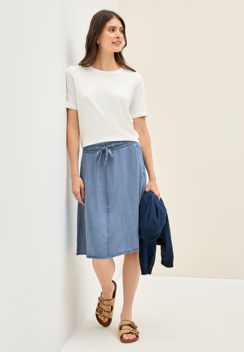 Dieser knielange Rock von CECIL bringt mit seiner weich fallenden Lyocell-Qualität einen eleganten Look. Der elastische Tunnelzugbund und die Taschen machen ihn alltagstauglich. Die Washed-Optik sorgt für ein lässiges Finish. Knielanger Denim Rock Seitliche Taschen Elastischer Bund mit Tunnelzug Weich fallend Angenehmer Lyocell-Qualität Material: 100% Lyocell
