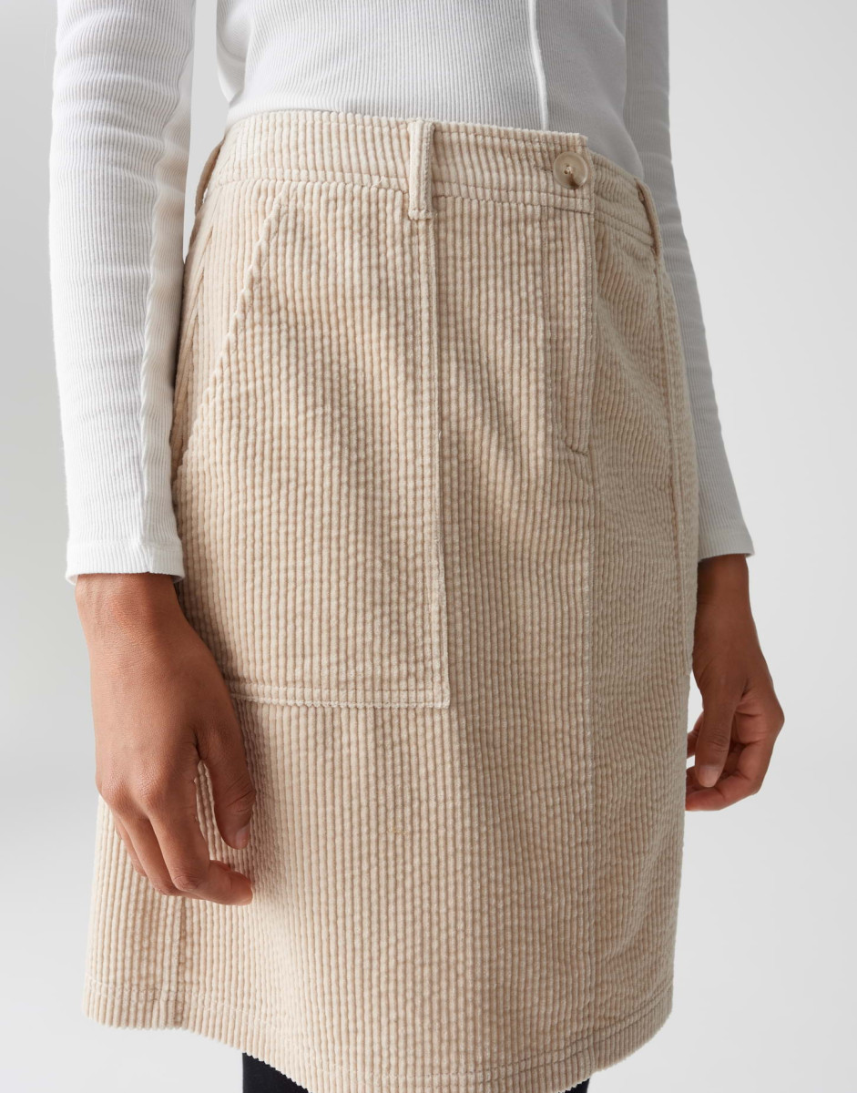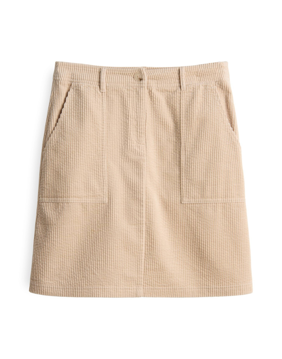 Dieser stilvolle Minirock überzeugt durch seine modische Cord-Textur, die ihm eine angenehme Haptik und einen trendigen Retro-Touch verleiht. Das Material mit breiter Rippstruktur ist robust und gleichzeitig weich im Griff. Der Rock präsentiert sich in einer klassischen A-Linien-Form, die eine schmeichelhafte Silhouette schafft. Er verfügt über einen Bund mit Gürtelschlaufen und wird vorne mit einem Knopf und Reißverschluss geschlossen. Zwei große, aufgesetzte Taschen vorne unterstreichen den lässigen Look und bieten praktischen Stauraum. Dieser vielseitige Rock ist ein ideales Key-Piece für die Übergangszeit und den Winter, das sich hervorragend mit Stiefeln, Strumpfhosen und Strickwaren kombinieren lässt.