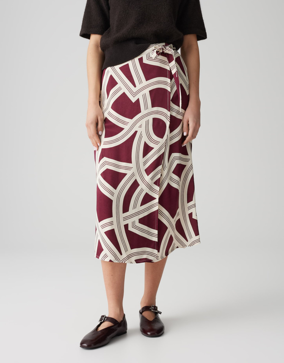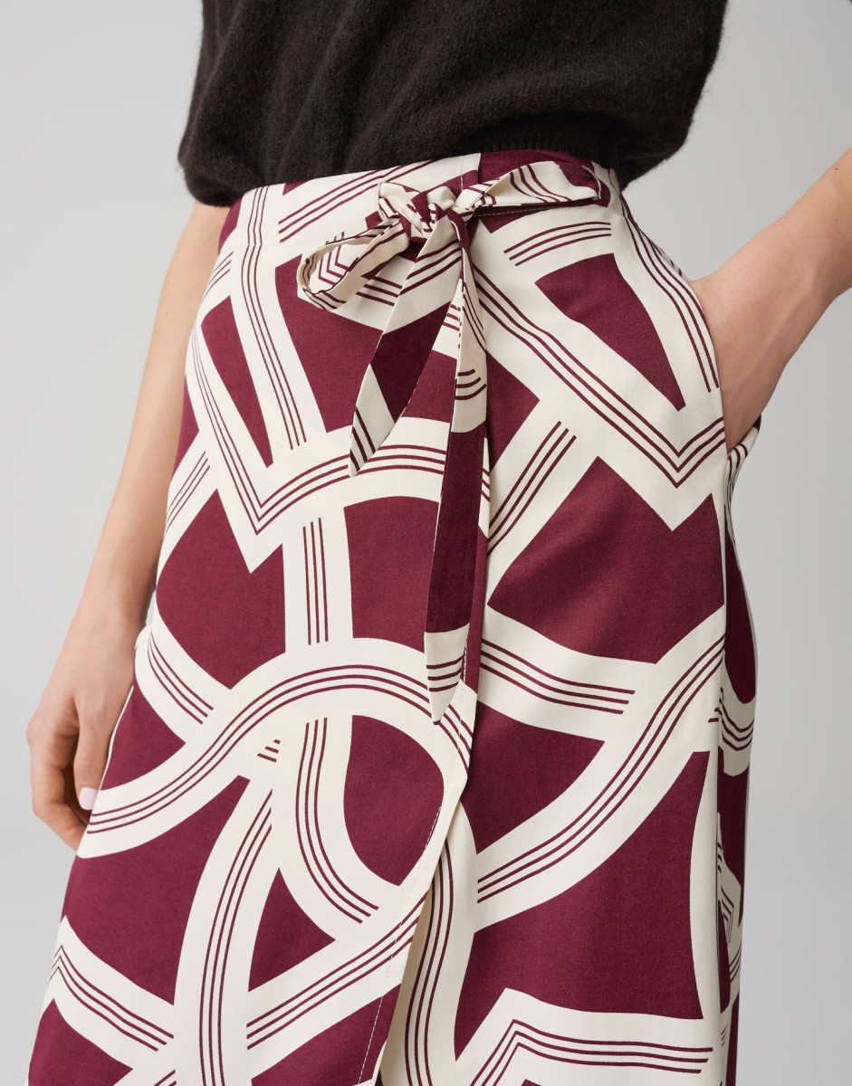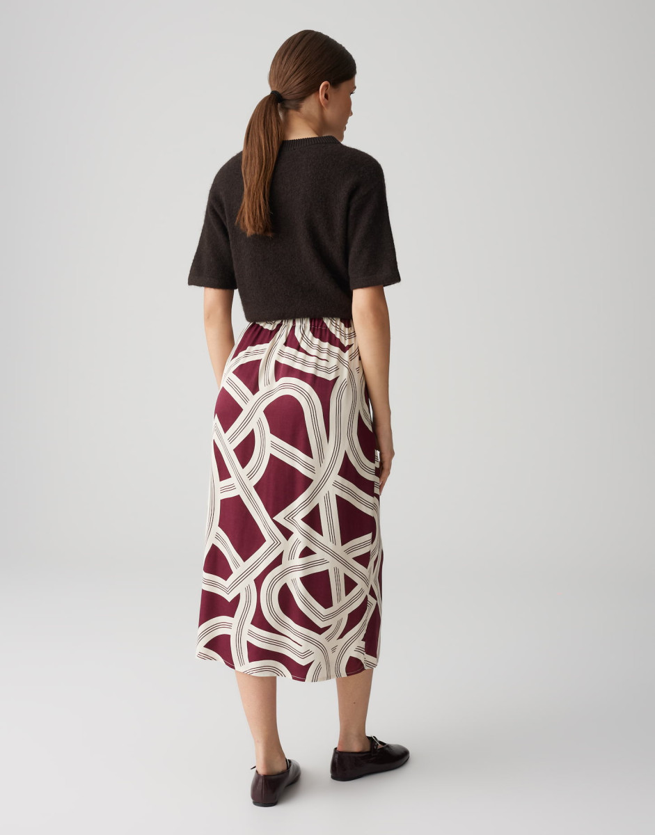 Das grafische Muster verleiht dem Design eine moderne Note, während der elastische Bund hinten für optimalen Tragekomfort sorgt. Seitliche Eingrifftaschen bieten praktische Details, das Knotendetail an der Seite unterstreicht den besonderen Charakter des Rocks. Mit einer hinteren Länge von ca. 81 cm schmeichelt er jeder Figur und lässt sich vielseitig kombinieren.