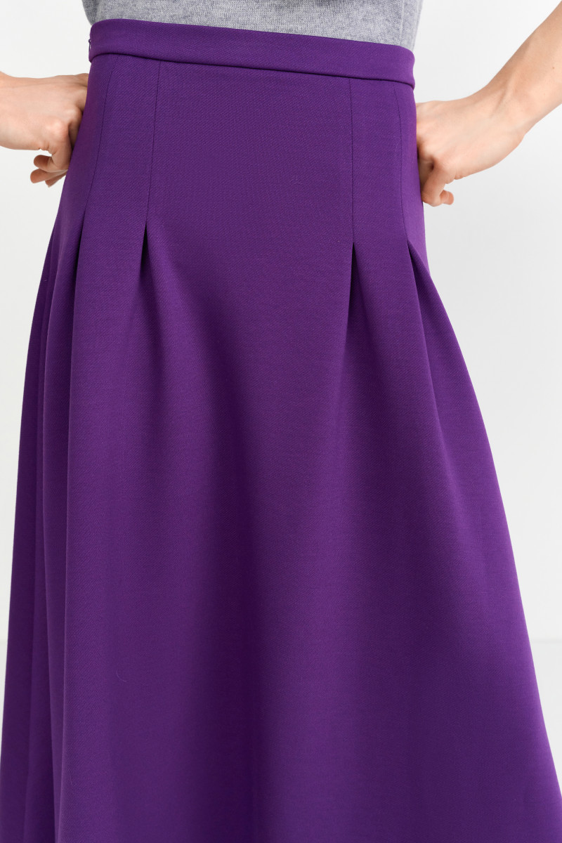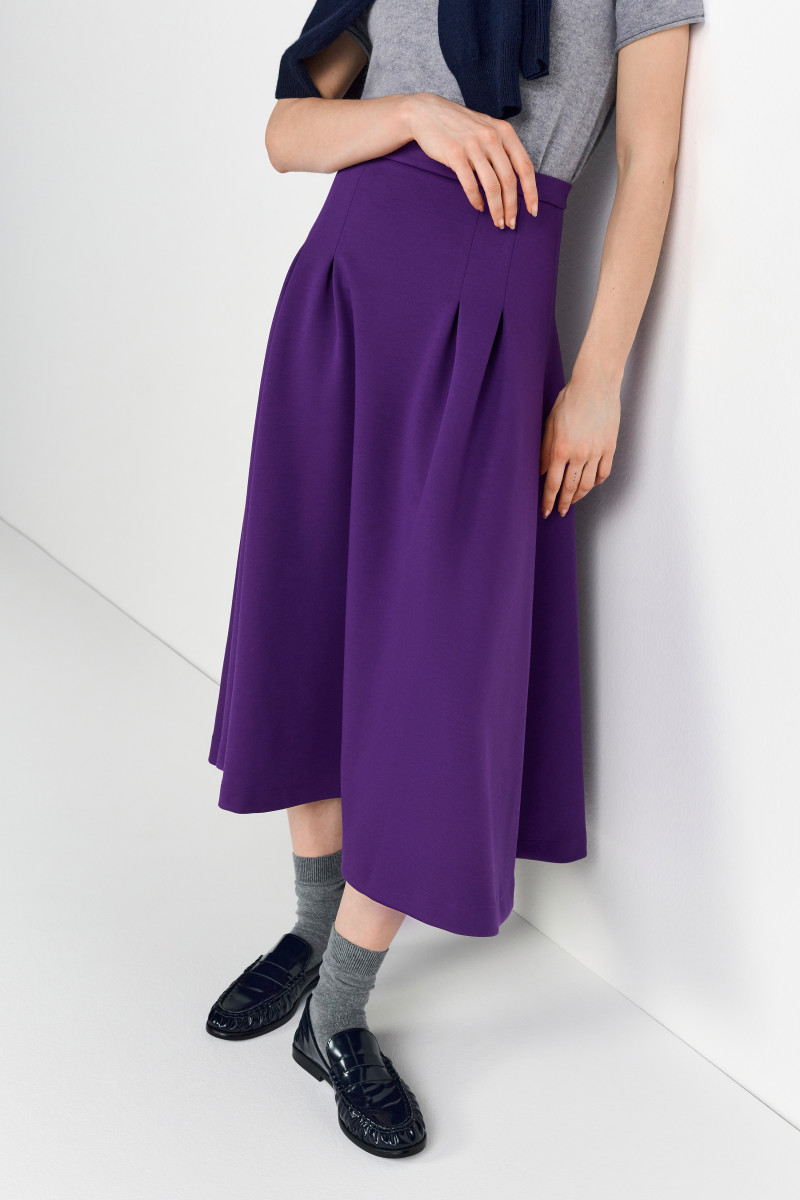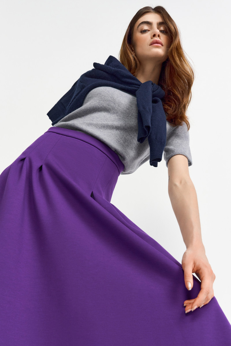 Dieser bezaubernde lila Midirock setzt mit seinem modernen Design und der raffinierten Farbwahl ein echtes modisches Statement. Der Rock ist in einem angenehmen, weichen Stoff gefertigt, der perfekt fällt und eine schmeichelhafte Silhouette zaubert. Die markanten Falten sorgen für eine fließende Bewegung und verleihen dem Rock eine elegante, zugleich entspannte Ausstrahlung. Der elastische Bund garantiert einen hohen Tragekomfort und einen perfekten Sitz, während die mittellange Länge sowohl für den Alltag als auch für besondere Anlässe geeignet ist. Kombiniert mit einem schlichten Top oder einer schicken Bluse lässt sich dieser Rock sowohl im Büro als auch beim Abendessen oder einem festlichen Event perfekt tragen. Ein absolutes Must-have für alle, die Farbe und Stil in ihre Garderobe bringen möchten!