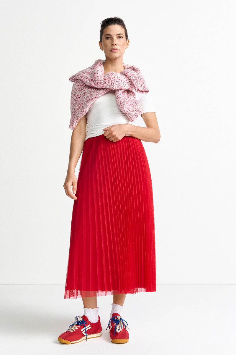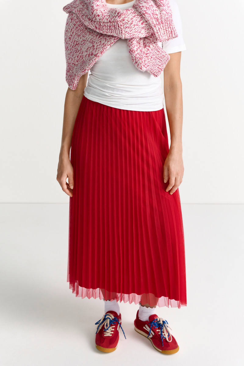 Setzen Sie ein leuchtendes Fashion-Statement mit diesem wunderschönen Plissee-Midirock in einem kräftigen Kirschrot (oder Fuchsia-Rot). Der Rock ist das perfekte Key-Piece, um Farbe in Ihre Garderobe zu bringen und eignet sich ideal für elegante Anlässe, das Büro oder stilvolle Alltags-Looks.