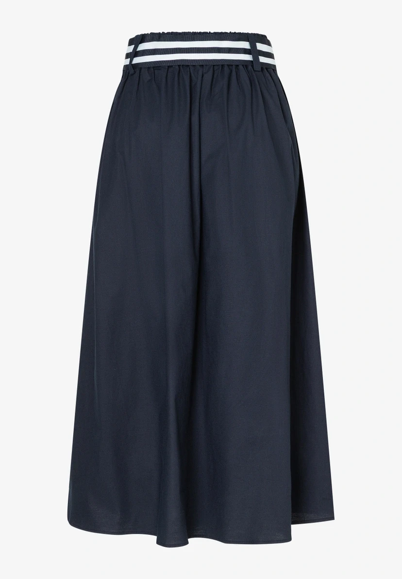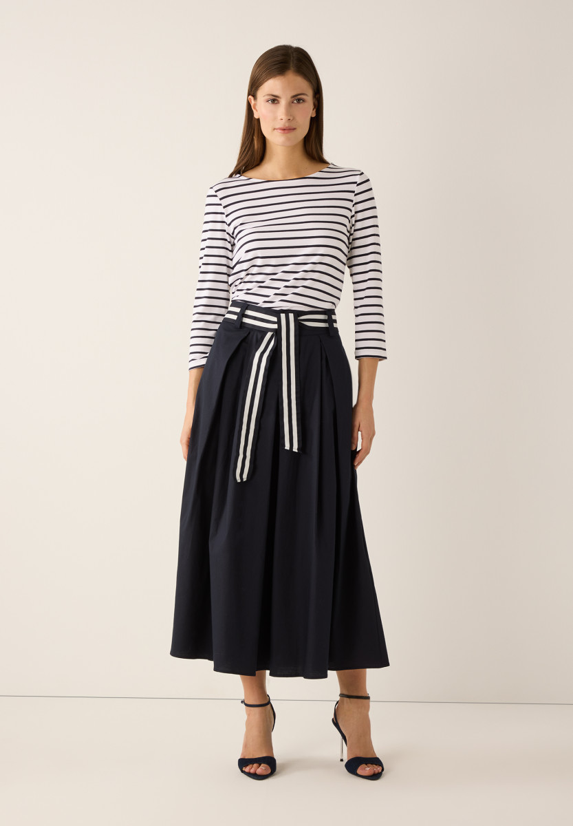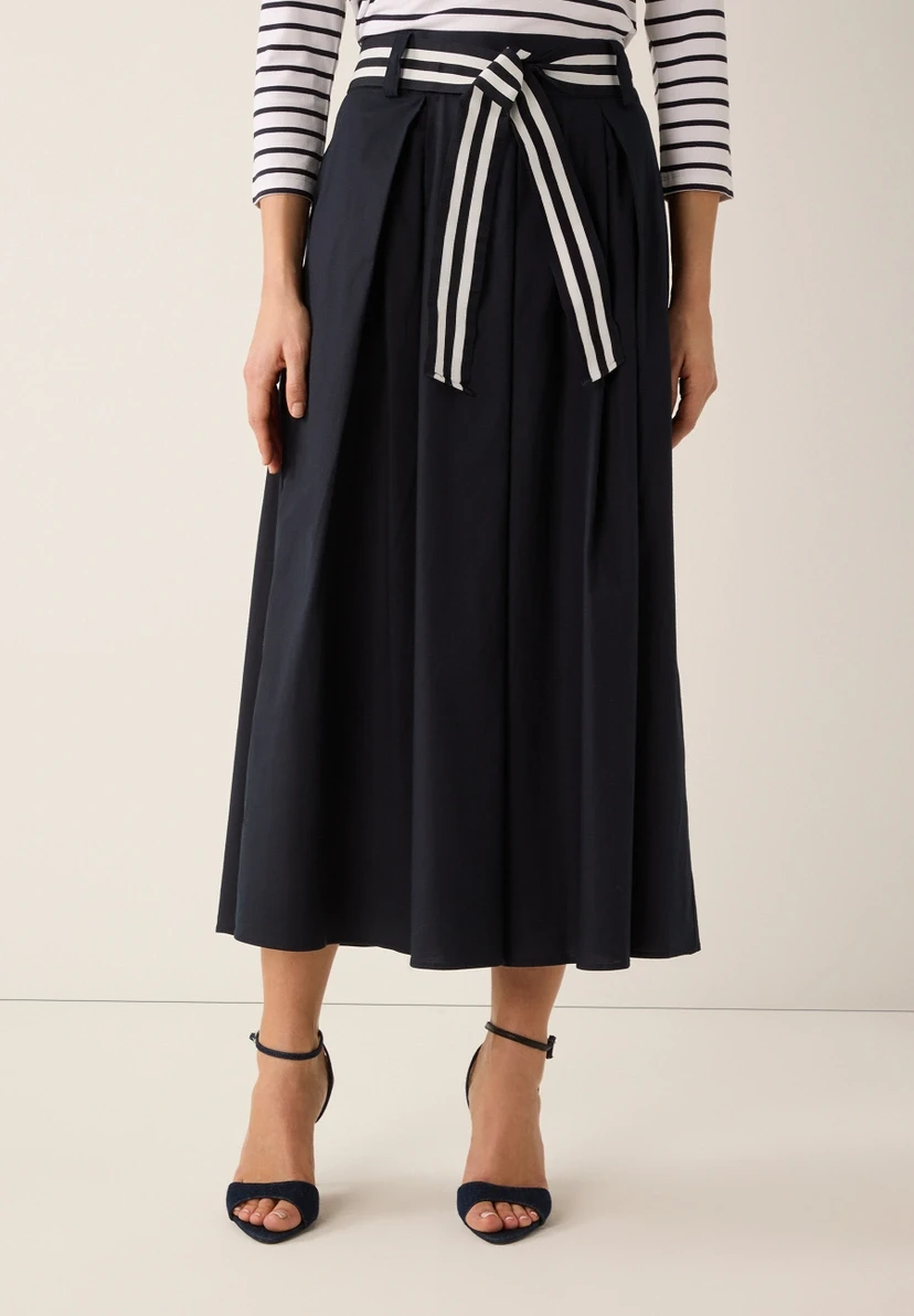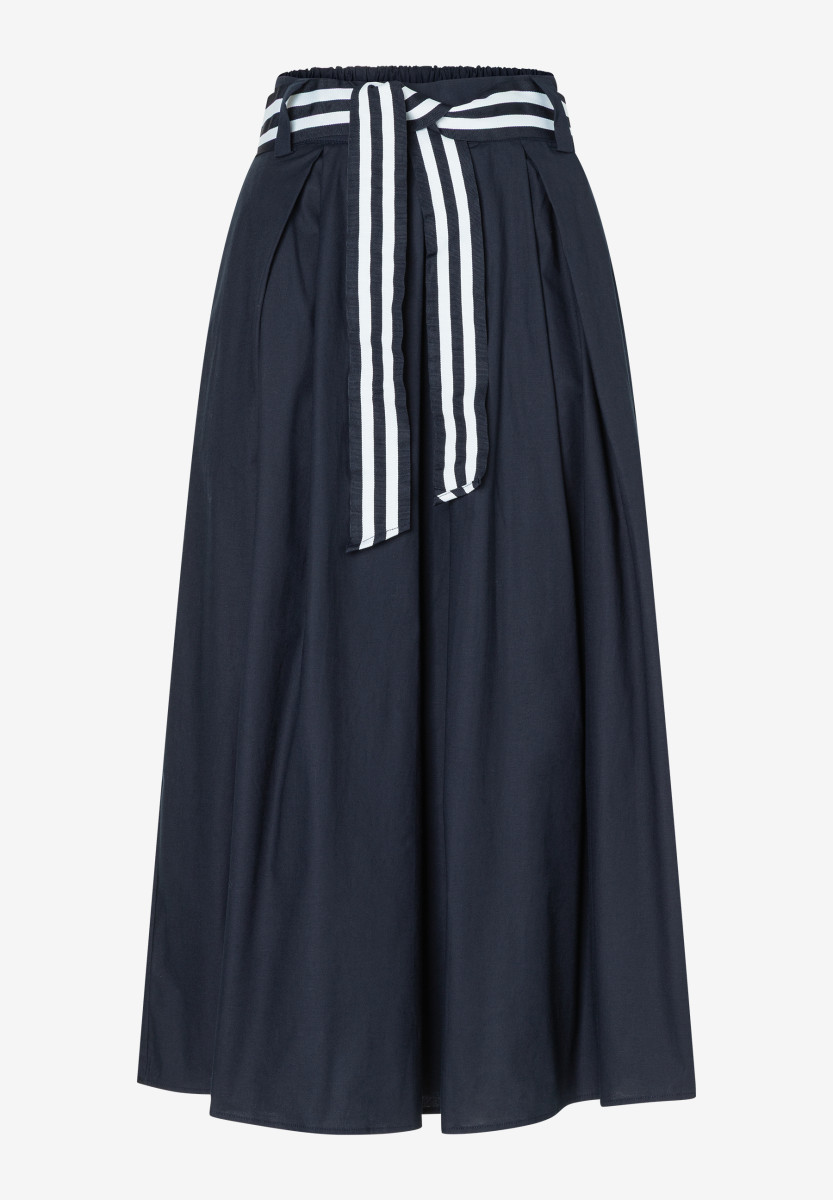 Weite, ausgestellte Silhouette | Moderne Midi-Länge | Bund mit Gürtelschlaufen und Gummizug hinten | Gestreiftes Ripsband als Bindegürtel | Schräge Eingrifftaschen | Kellerfalten vorne | Hautfreundliche Baumwollqualität mit kleinem Stretchanteil | Ungefüttert