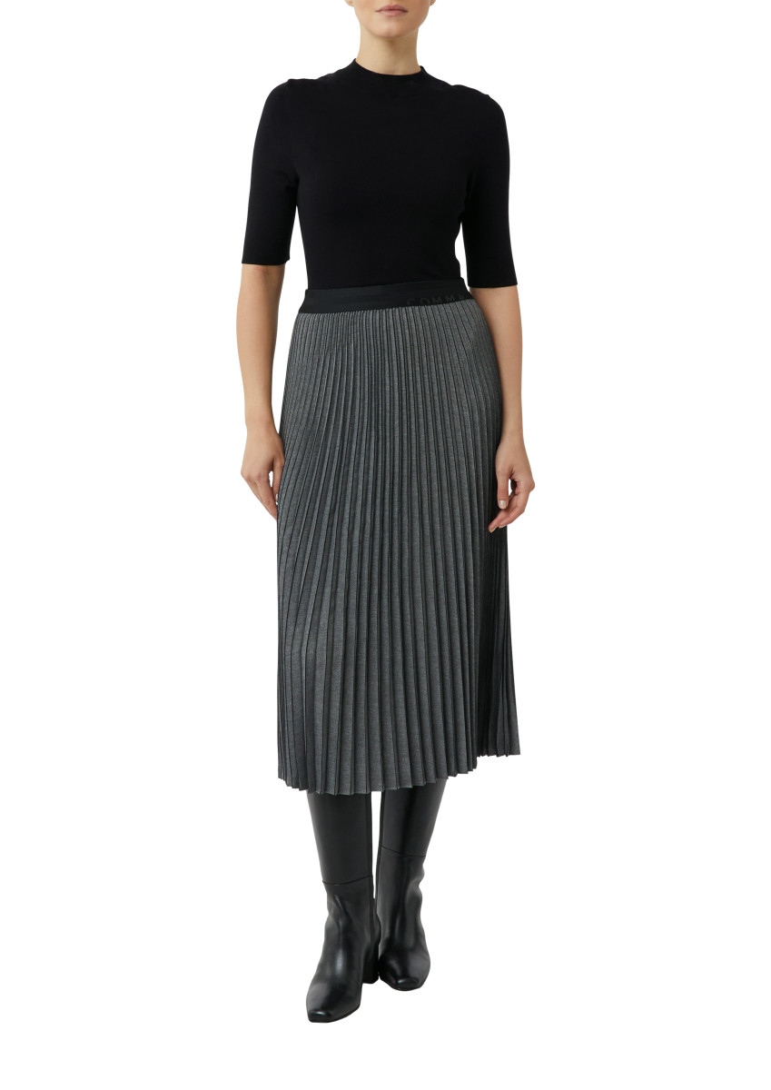 Dieser plissierte Flanellrock in eleganter Midilänge vereint zeitlose Raffinesse mit modernem Komfort. Der fließende Plissee-Stoff schmeichelt jeder Silhouette und sorgt für feminine Bewegung bei jedem Schritt. Dank des praktischen Elastikbunds genießen Sie angenehmen Tragekomfort den ganzen Tag. Der hochwertige Flanell verleiht dem Rock eine edle Haptik und wärmende Eigenschaften. Kombinieren Sie ihn mit feinen Strickpullovern und Ankle Boots für einen stilvollen Herbstlook oder dressen Sie ihn mit Bluse und Pumps elegant auf.