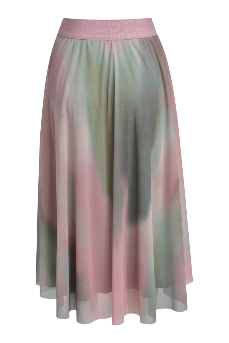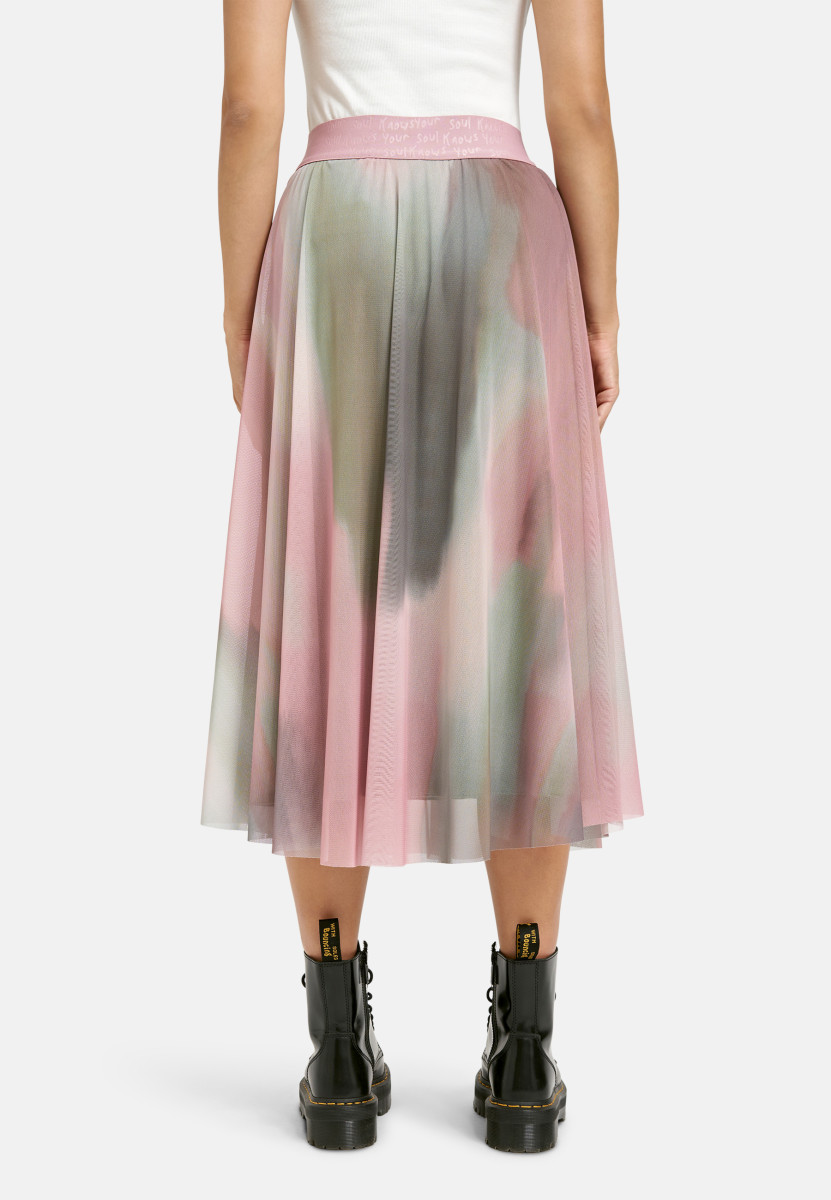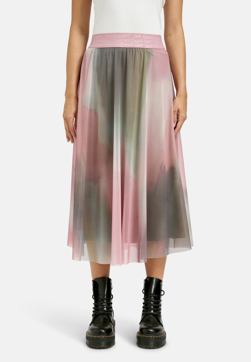 Dieser ausgestellte Midirock ist ein feminines Highlight mit einem modernen, fließenden Look. Das transparente Mesh-Obermaterial ist mit einem sanften Farbverlauf oder Batikmuster versehen, das weiche Übergänge schafft. Der Rock hat ein blickdichtes Futter, das für ein angenehmes Tragegefühl sorgt. Der breite, elastische Bund trägt einen auffälligen Schriftzug als Design-Detail. Die mittlere Länge und der schwingende Fall machen den Rock zu einem vielseitigen Stück, das sich sowohl elegant als auch lässig kombinieren lässt.