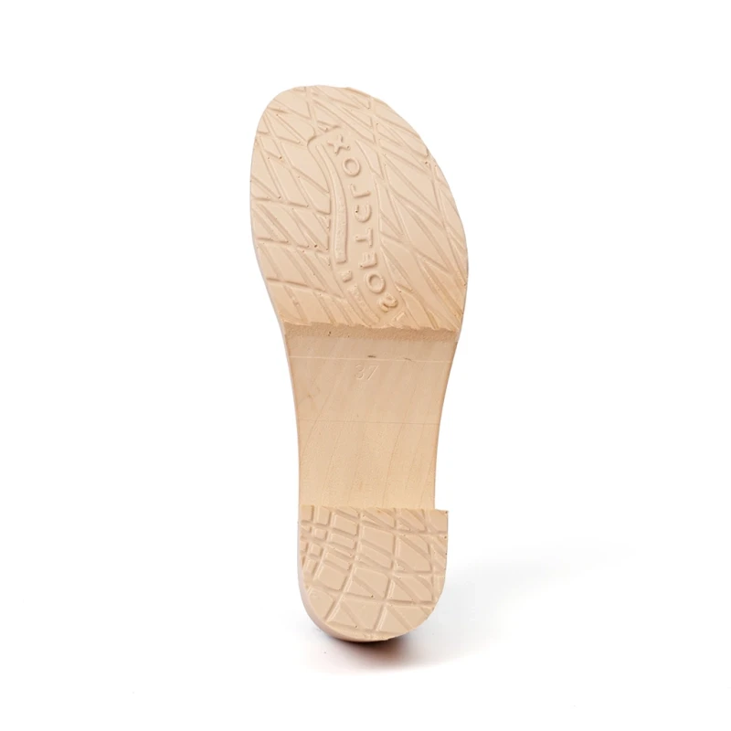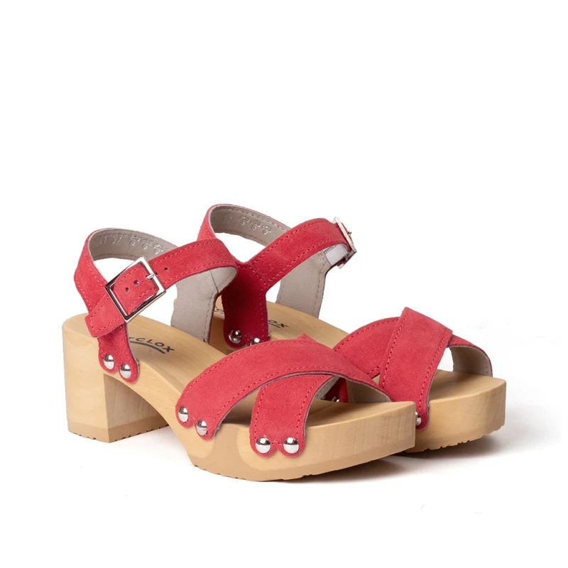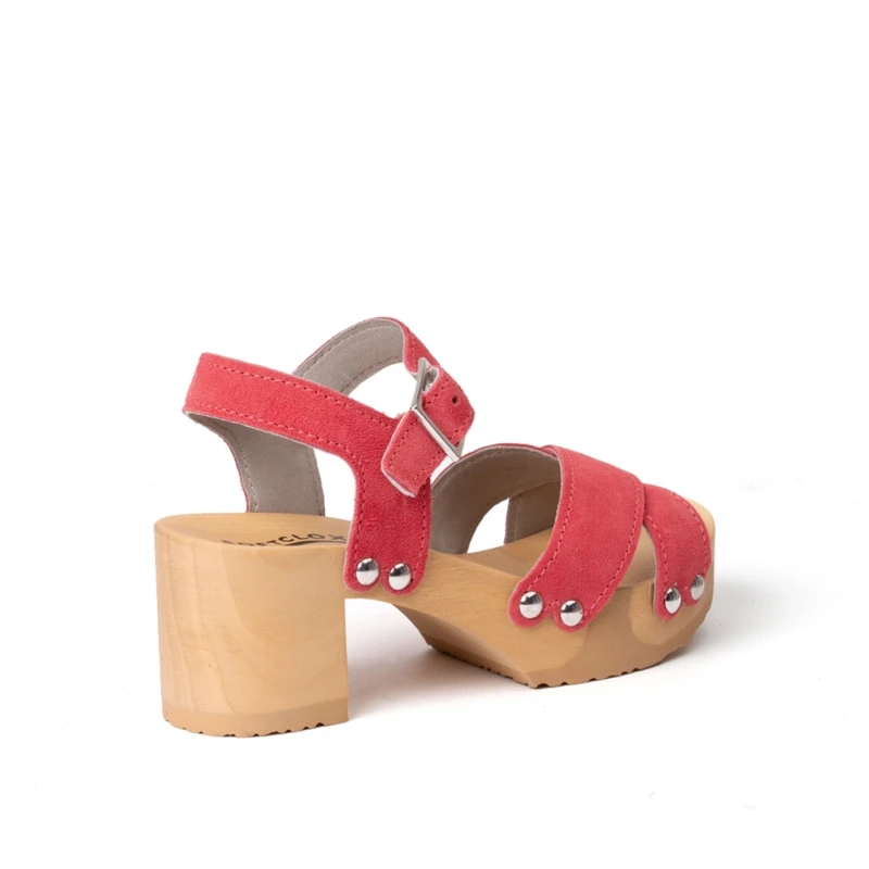 Farbflash – diese Sandalen sind Sommer pur. Leuchtend korallfarbenes Velousleder und temperaturausgleichende Holzsohle – der perfekte Begleiter für heiße Tage und heiße Looks.