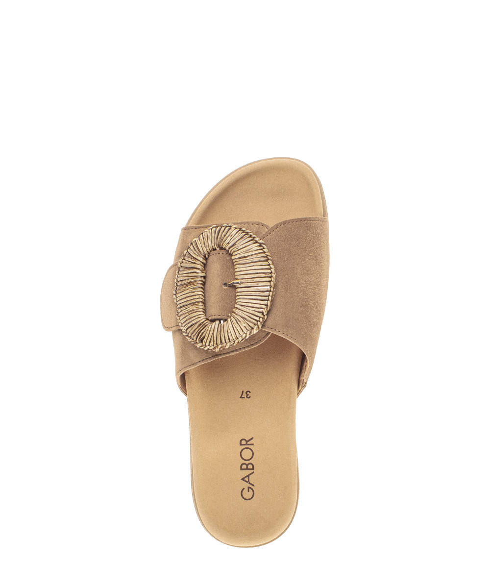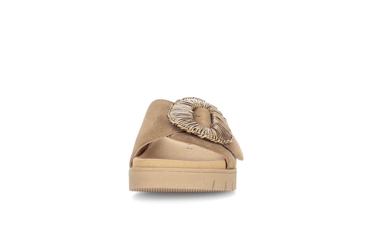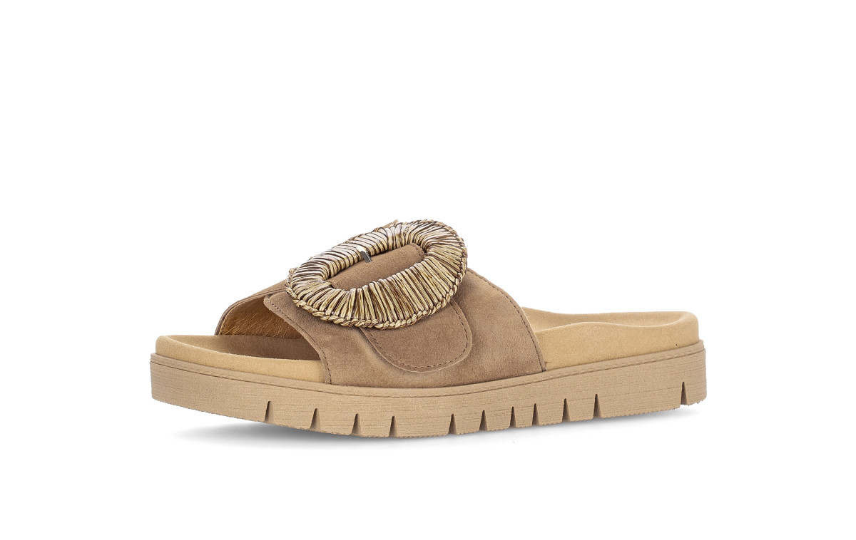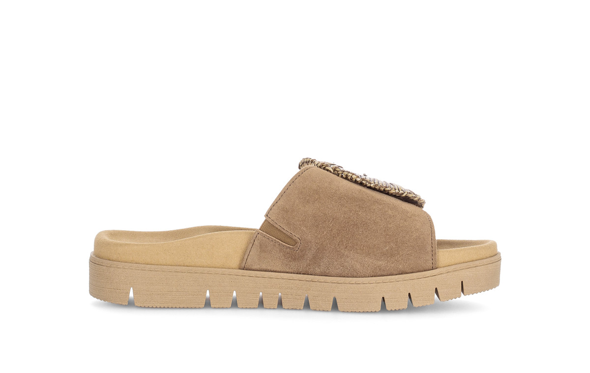 Diese Pantoletten für Damen zeichnen sich durch einen flachen Absatz mit einer Höhe von 35 mm, eine runde Schuhform und einen verstellbaren Klettverschluss aus. Der Klettverschluss ermöglicht einen einfachen Einstieg und sorgt für einen sicheren Sitz. Das Innenfutter ist aus Leder und rundet das hochwertige Erscheinungsbild ab.Lief.-Art-Nr: 83.742.14