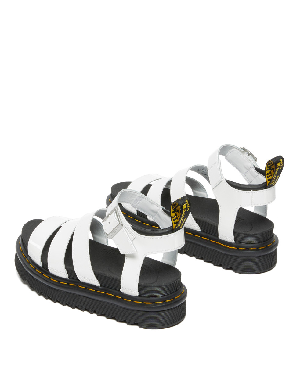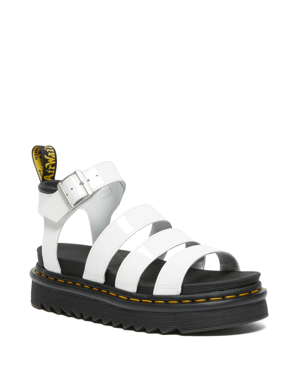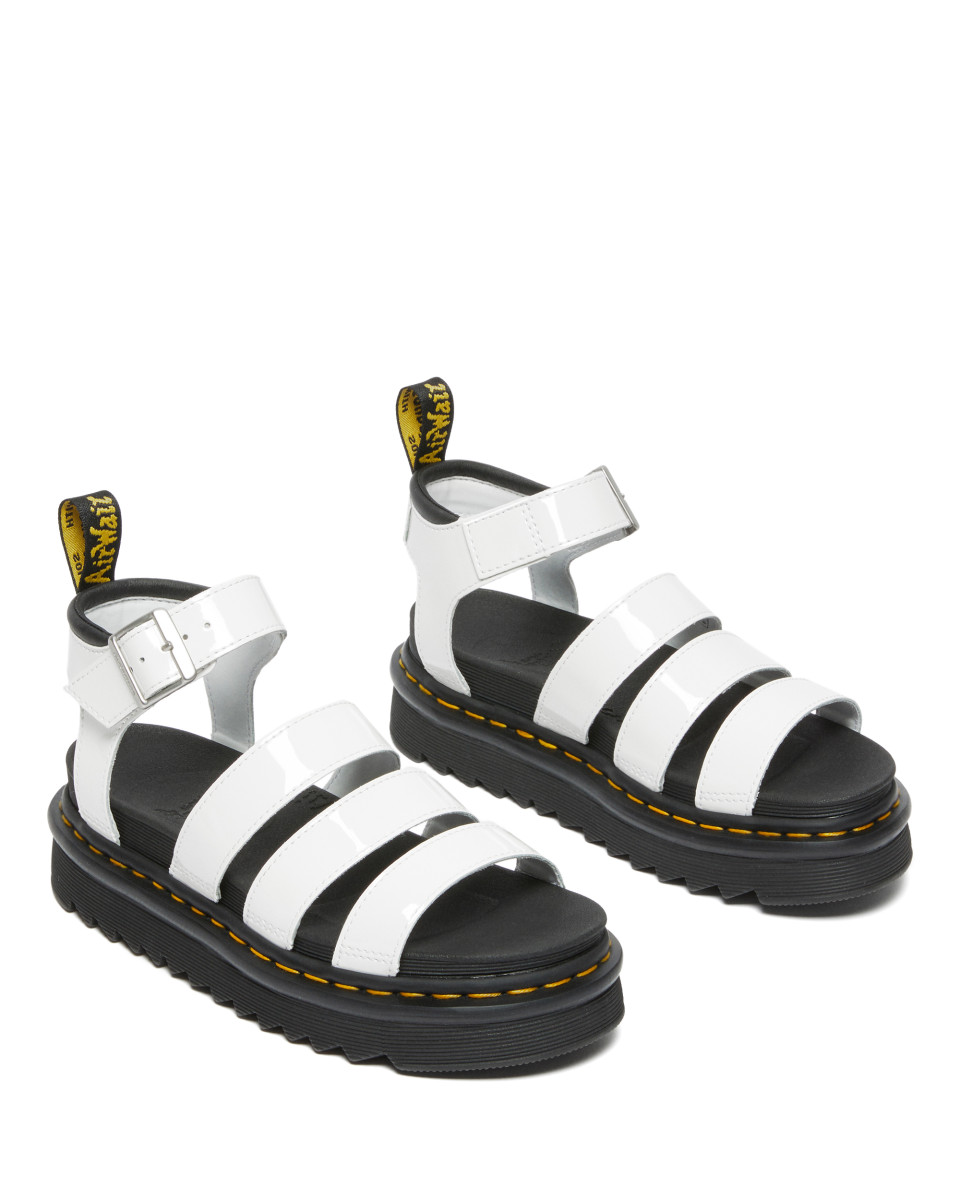Dicke Plateau-Sohle | Weißes Lederoberteil | Verstellbare Schnalle | Profilierte Sohle | Markante gelbe Naht | Individuell anpassbar | Modisches Design | Robuste Verarbeitung | Stabiler Halt | Flacher Absatz