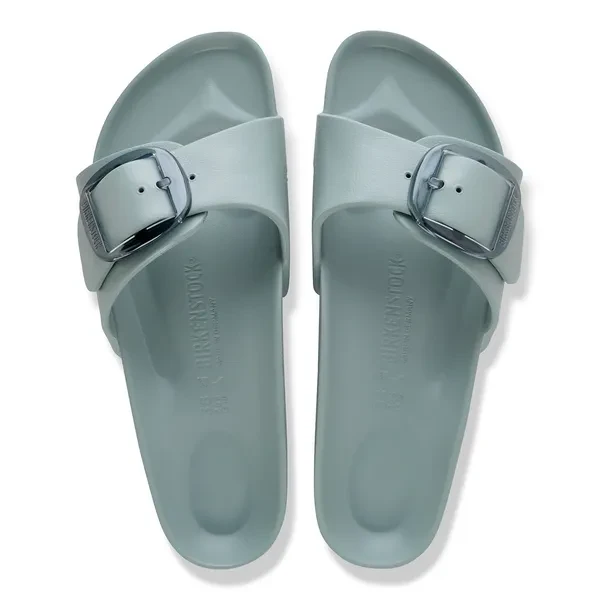 Der BIRKENSTOCK Klassiker Madrid wird hier neu und modern interpretiert. Diese Variante zeigt sich mit unserer beliebten Big Buckle die aus rostfreiem Kunststoff besteht und durch Langlebigkeit sowie ein minimalistisches Design überzeugt. Der Kork-Sandale nachempfunden, besteht dieses Modell aus besonders leichtem und sehr flexiblem EVA-Kunststoff. Der hochwertige, geruchsneutrale und schadstoffgeprüfte Kunststoff EVA vereint viele positive Eigenschaften: Er ist sehr leicht, hochelastisch, schockabsorbierend, wasserfest, und hautfreundlich.