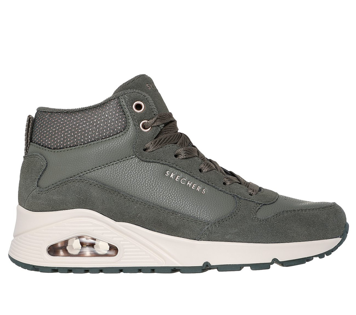 Straßenstyle trifft auf gemütlichen Komfort in den Skechers Street™ UNO - Stacre Shine. Dieser geschnürte Mid-Top-Fashion-Sneaker verfügt über ein Obermaterial aus Wildleder und Duraleather mit einem funkelnden Mesh-Kragen, eine gepolsterte Skechers Air-Cooled Memory Foam®-Innensohle und eine Skech-Air®-sichtbare Luftpolster-Mittelsohle.