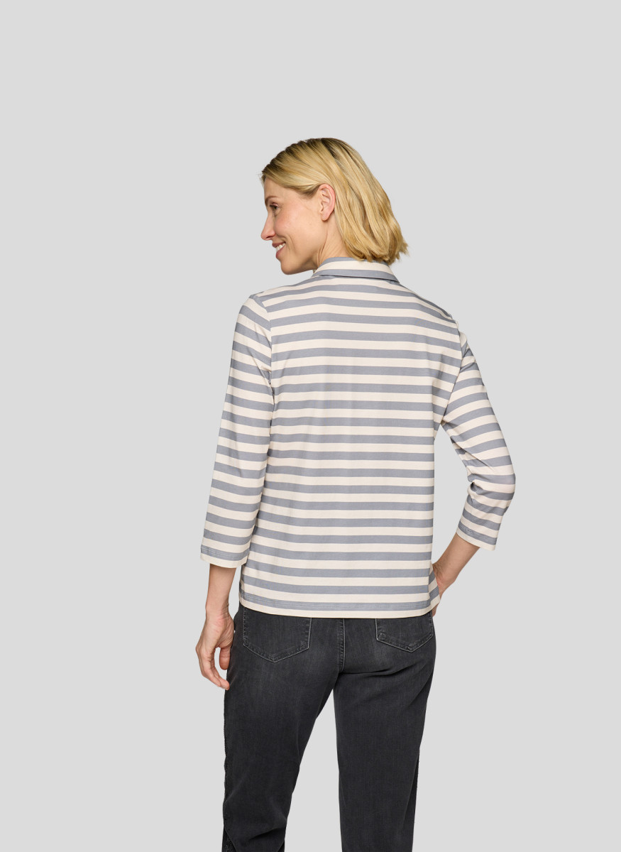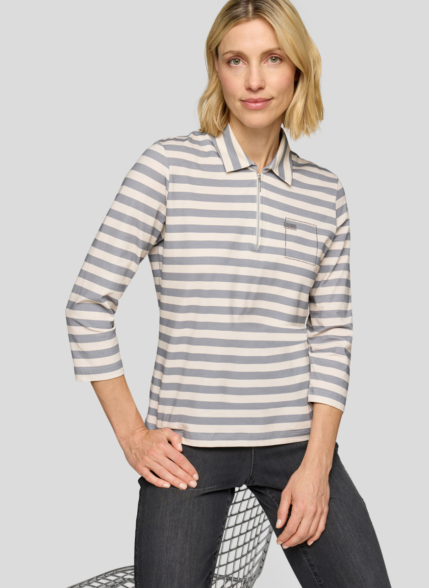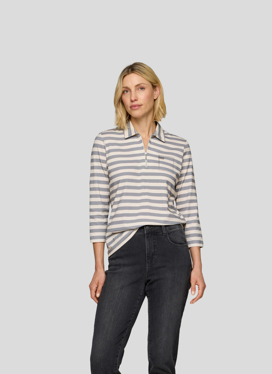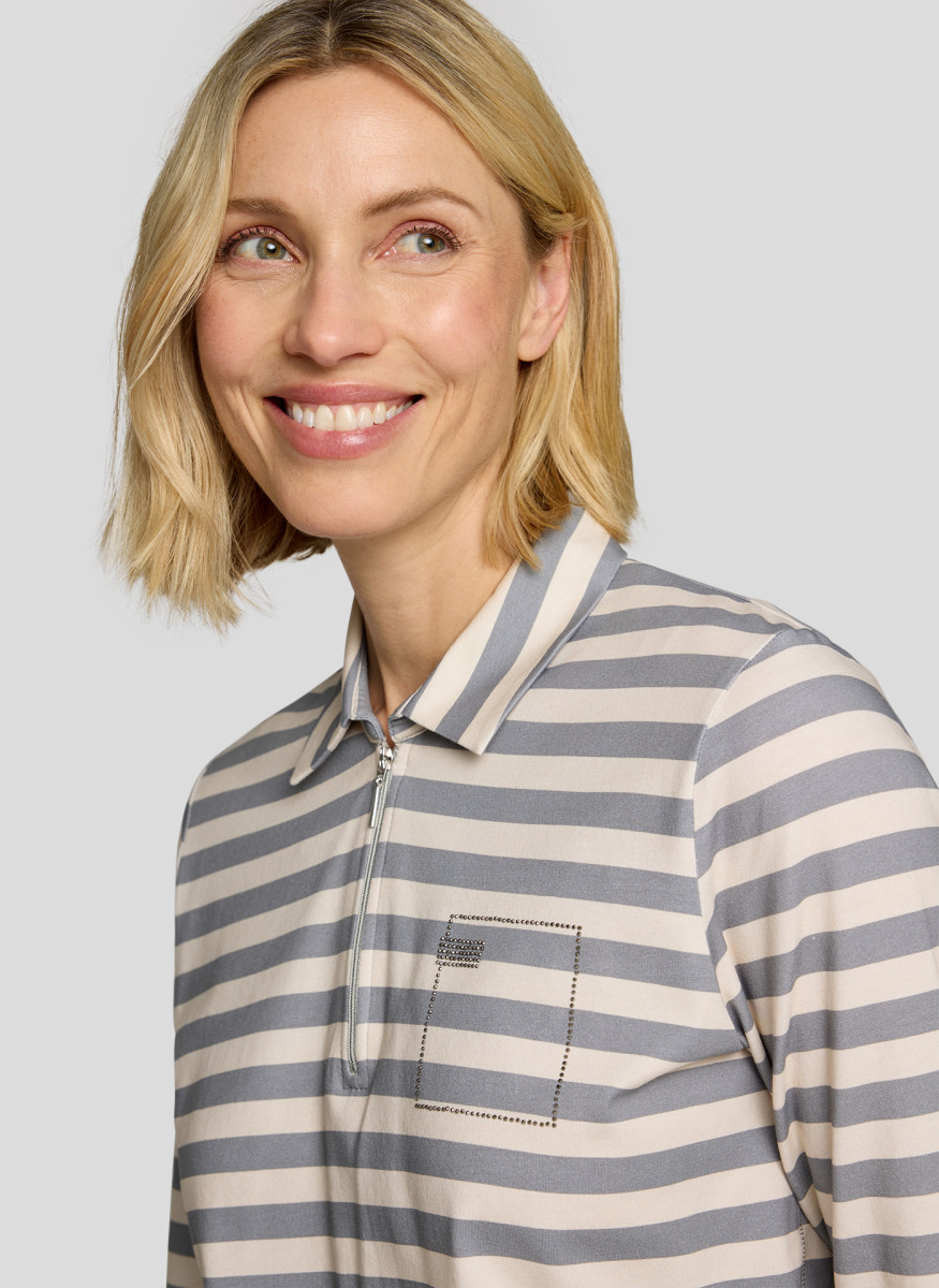 Dieses gestreifte Poloshirt bietet dank elastischem Baumwolljersey ein angenehmes Tragegefühl. Der Reißverschluss und der klassische Kragen sorgen für eine sportliche Note, während die Brusttasche mit Glitzersteinen einen dezenten Akzent setzt. Ideal für entspannte Alltagslooks mit Stil. Weiche, elastische Baumwollqualität. Reißverschluss-Ausschnitt für einfaches An- und Ausziehen. Polokragen für eine klassische Silhouette. 3/4-lange Ärmel. Dekotasche mit funkelnden Glitzersteinchen.