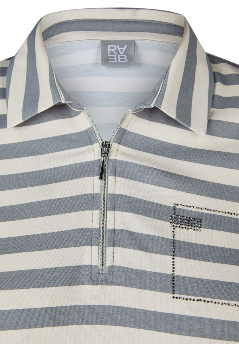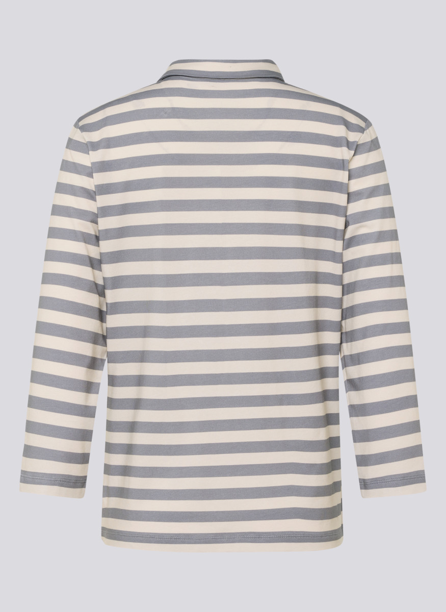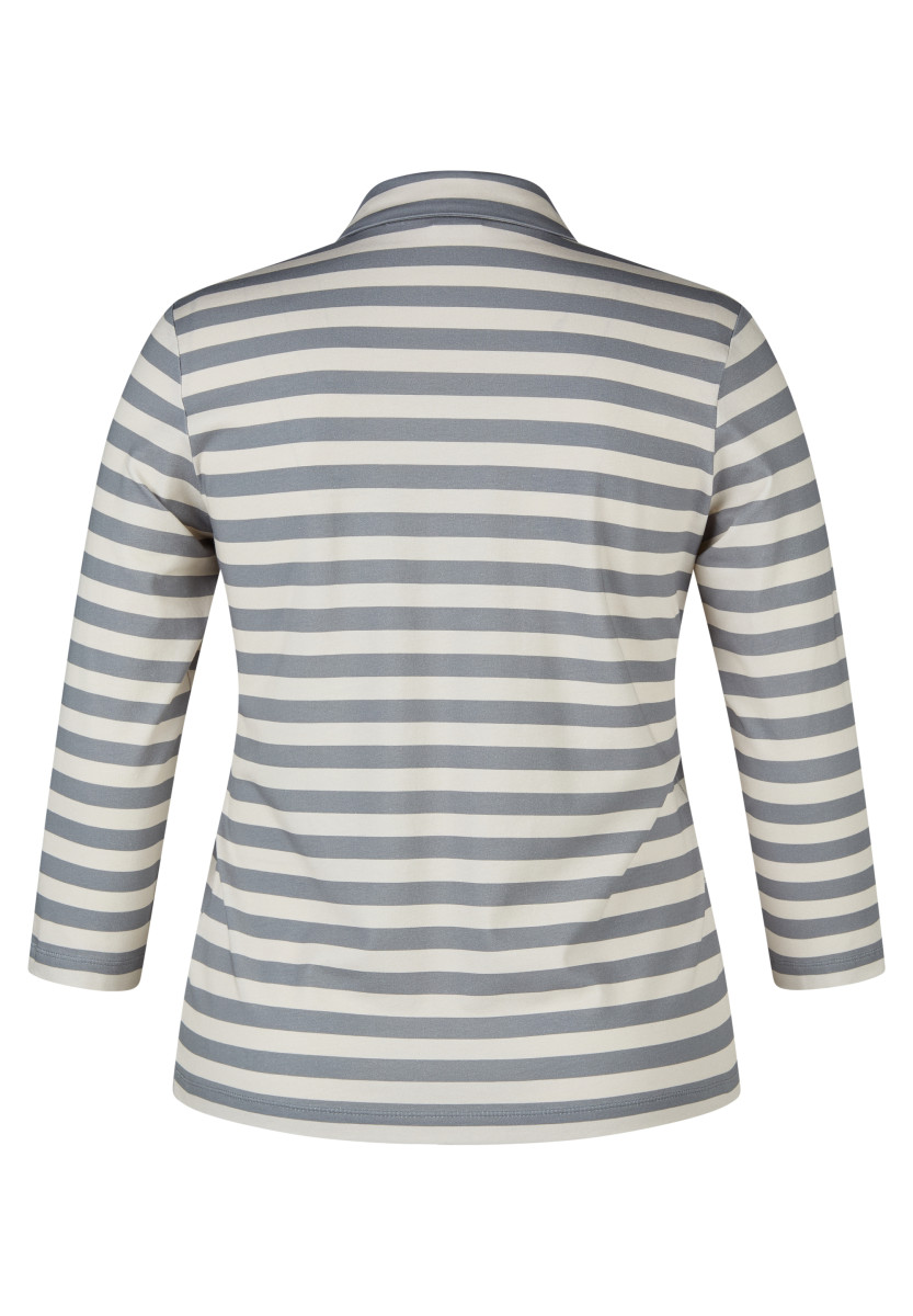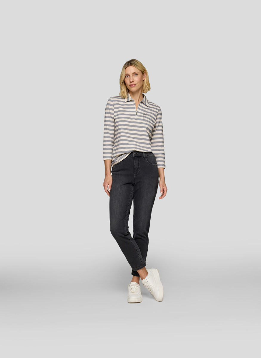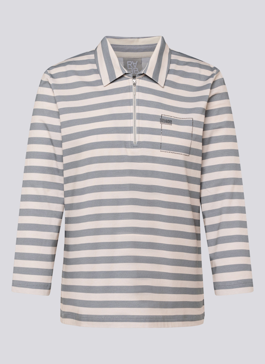 Dieses gestreifte Poloshirt bietet dank elastischem Baumwolljersey ein angenehmes Tragegefühl. Der Reißverschluss und der klassische Kragen sorgen für eine sportliche Note, während die Brusttasche mit Glitzersteinen einen dezenten Akzent setzt. Ideal für entspannte Alltagslooks mit Stil. Weiche, elastische Baumwollqualität. Reißverschluss-Ausschnitt für einfaches An- und Ausziehen. Polokragen für eine klassische Silhouette. 3/4-lange Ärmel. Dekotasche mit funkelnden Glitzersteinchen.