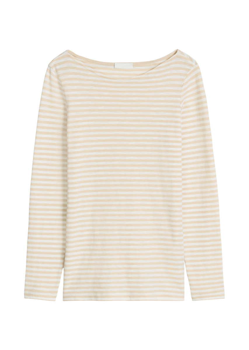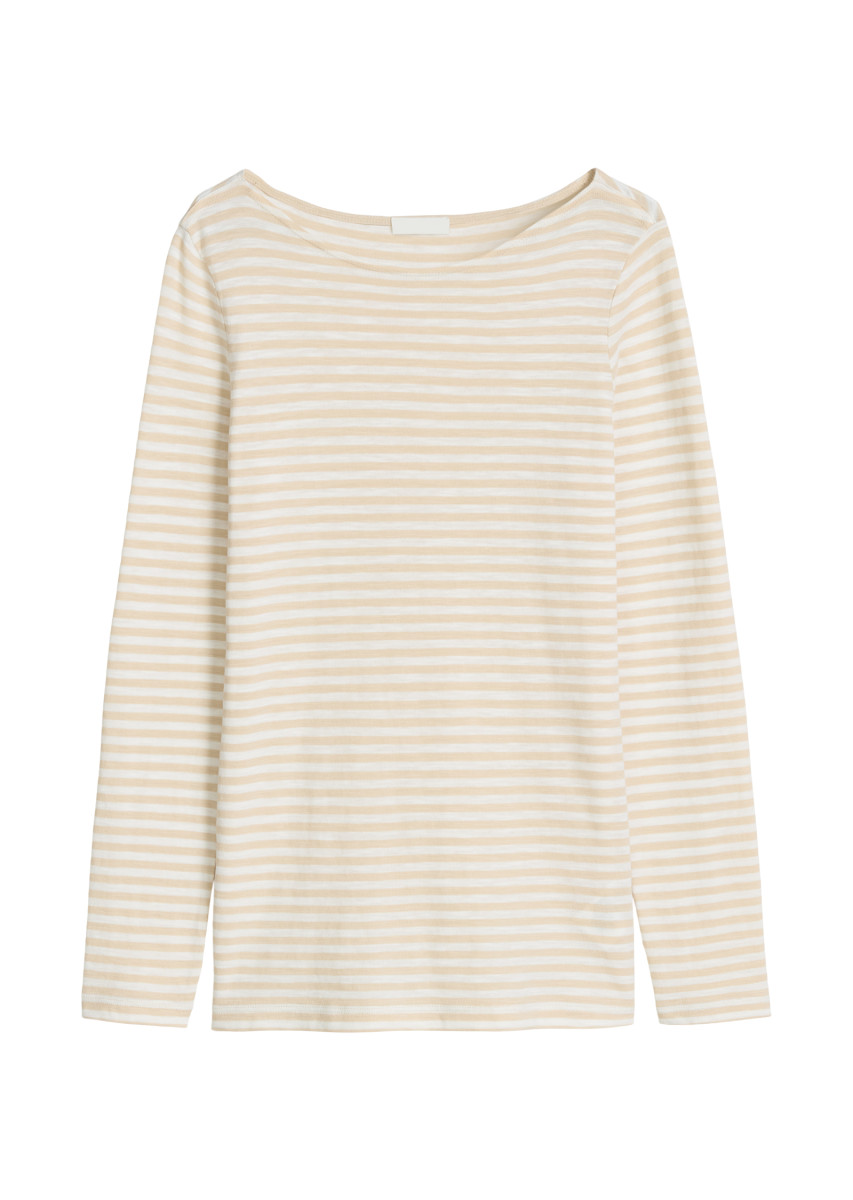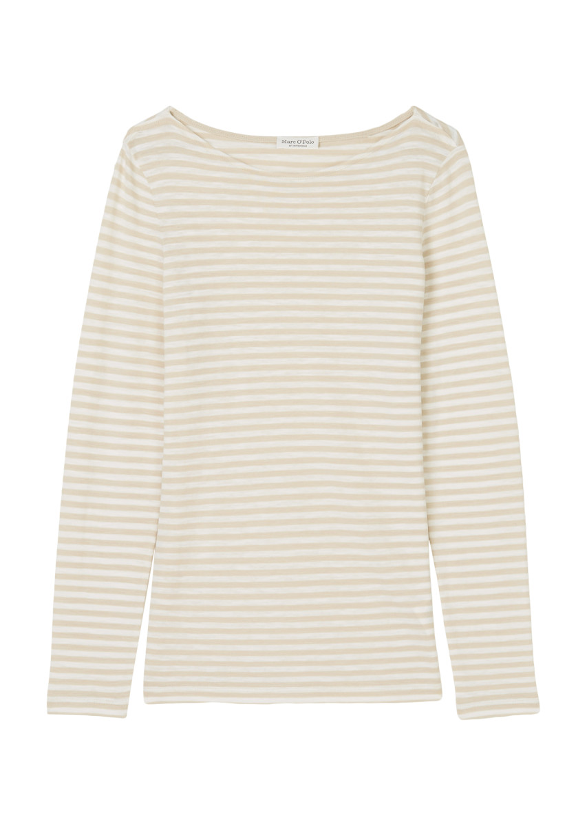 Es ist DAS Essential für den berühmten French Chic: das superlässige Ringel-Longsleeve aus weicher, reiner Bio-Baumwolle in hochwertiger Slub-Jersey-Qualität. Modell mit U-Boot-Ausschnitt und dezentem Logoprint am Saum. Der Griff: weich, locker und körnig zugleich. Dieses hochwertige Kleidungsstück aus biologisch angebauter Baumwolle ist Ausdruck unserer Verantwortung für die Umwelt. Wie kein anderes verbindet es Eleganz mit Lässigkeit und passt am besten zu ausgestellten Jeans, weiten Hosen, fließenden Röcken und Blazern.
