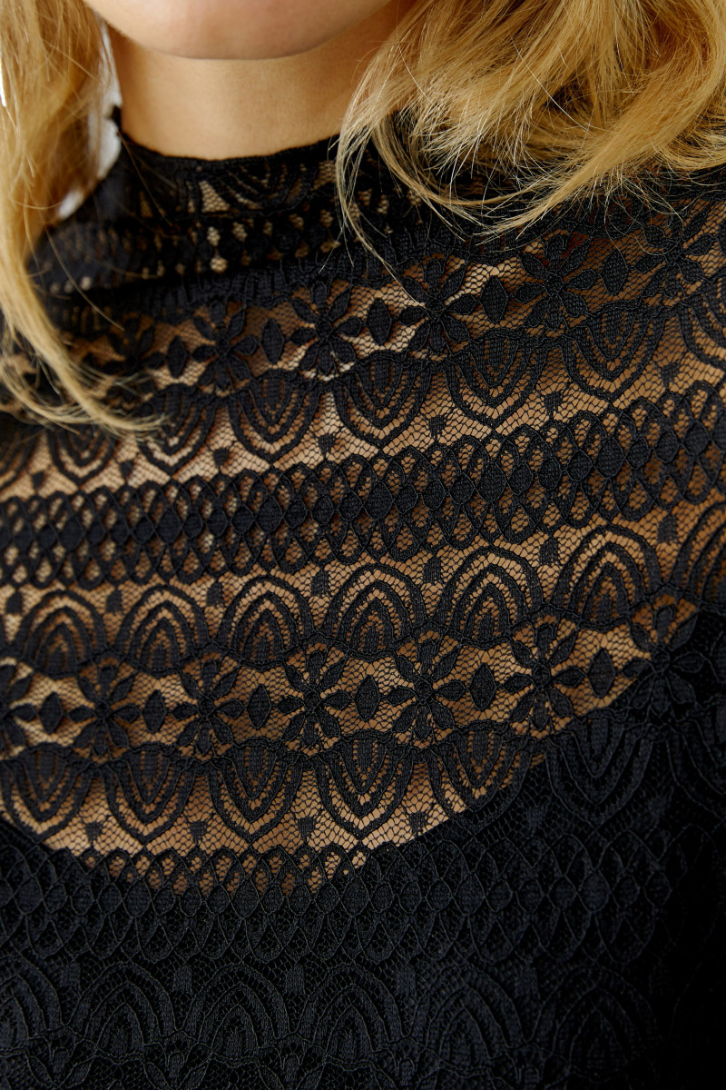 Weiche, elastische Spitze, transparent Schmal geschnitten, reguläre Länge Angeschnittener kurzer Stehkragen Langer, schmaler Arm Abschluss am Ärmel und Saum mit Bogenkante * Länge bei Größe 36: 62cm