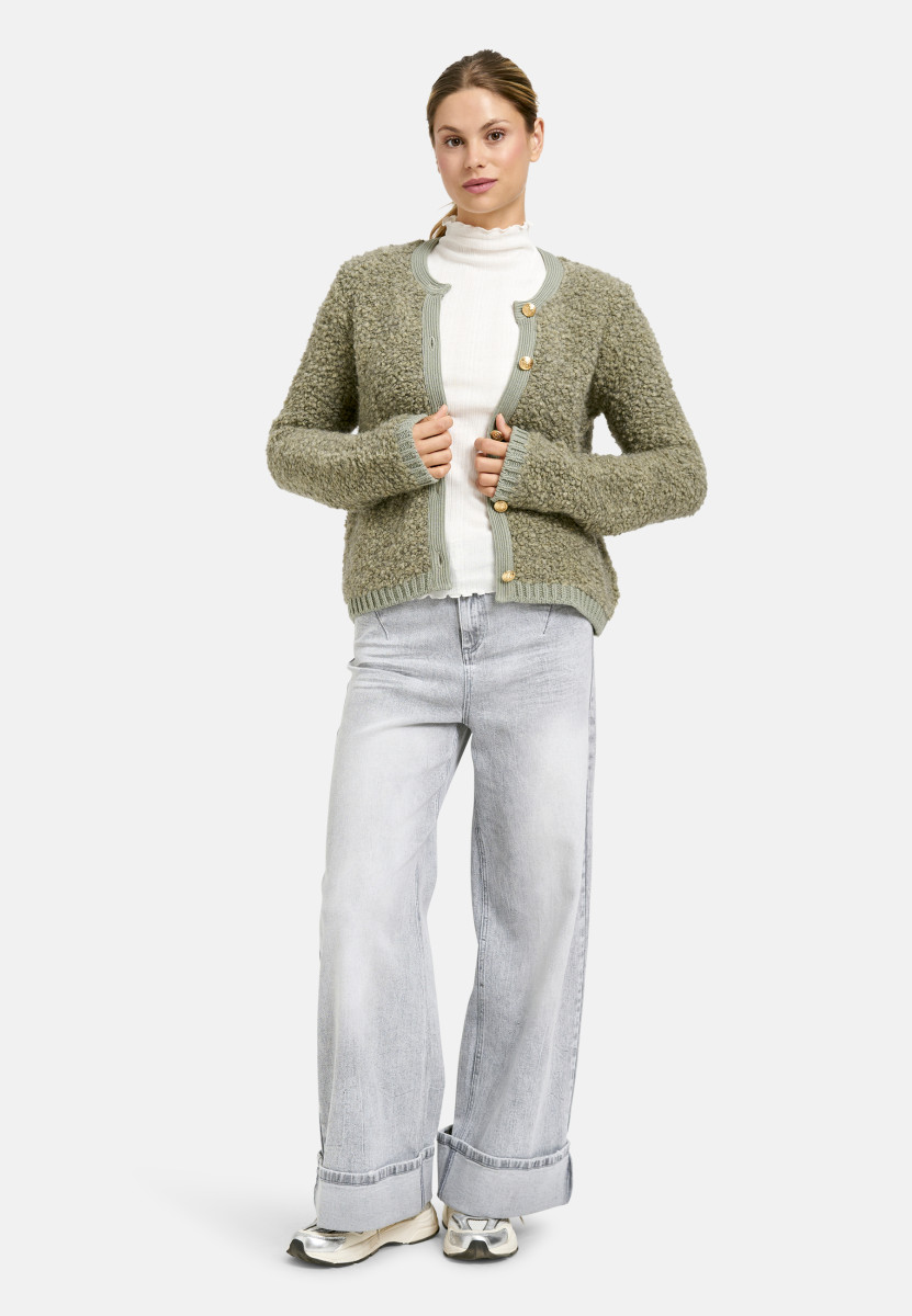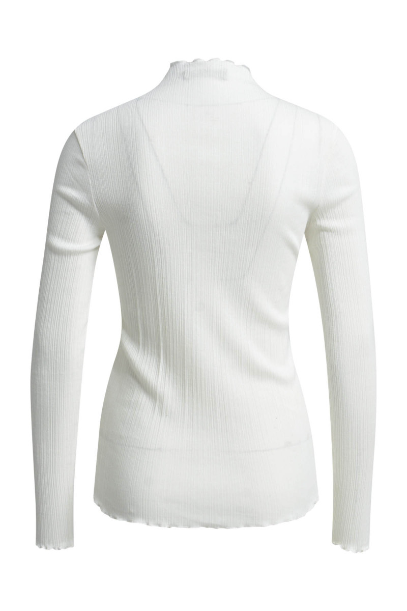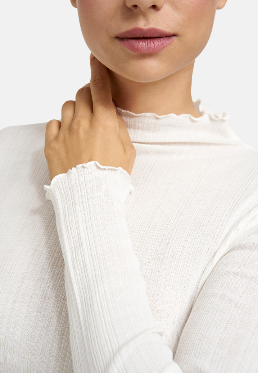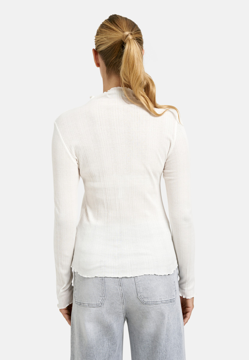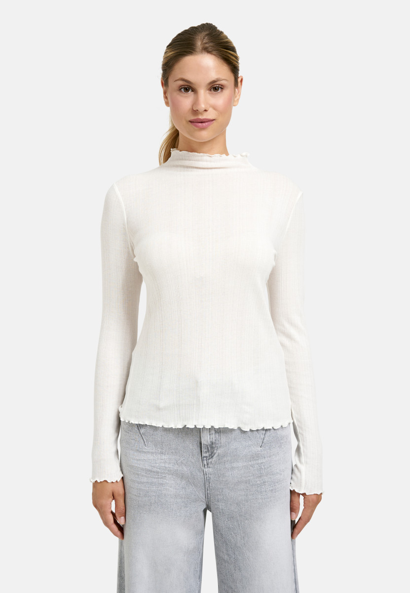 Dieses eng anliegende Langarmshirt besticht durch sein feingestricktes Ripp-Material, das eine angenehme Textur bietet. Die schmale Passform und das elastische Gewebe betonen sanft die Figur. Ein besonderes feminines Detail sind die gewellten, zarten Rüschenkanten am Stehkragen sowie an den Ärmel- und Saumabschlüssen. Dieses vielseitige Top mit hohem Kragen ist ideal zum Layern unter Pullis oder Jacken oder als stilvolles Basic, das sowohl solo als auch kombiniert einen eleganten Akzent setzt.