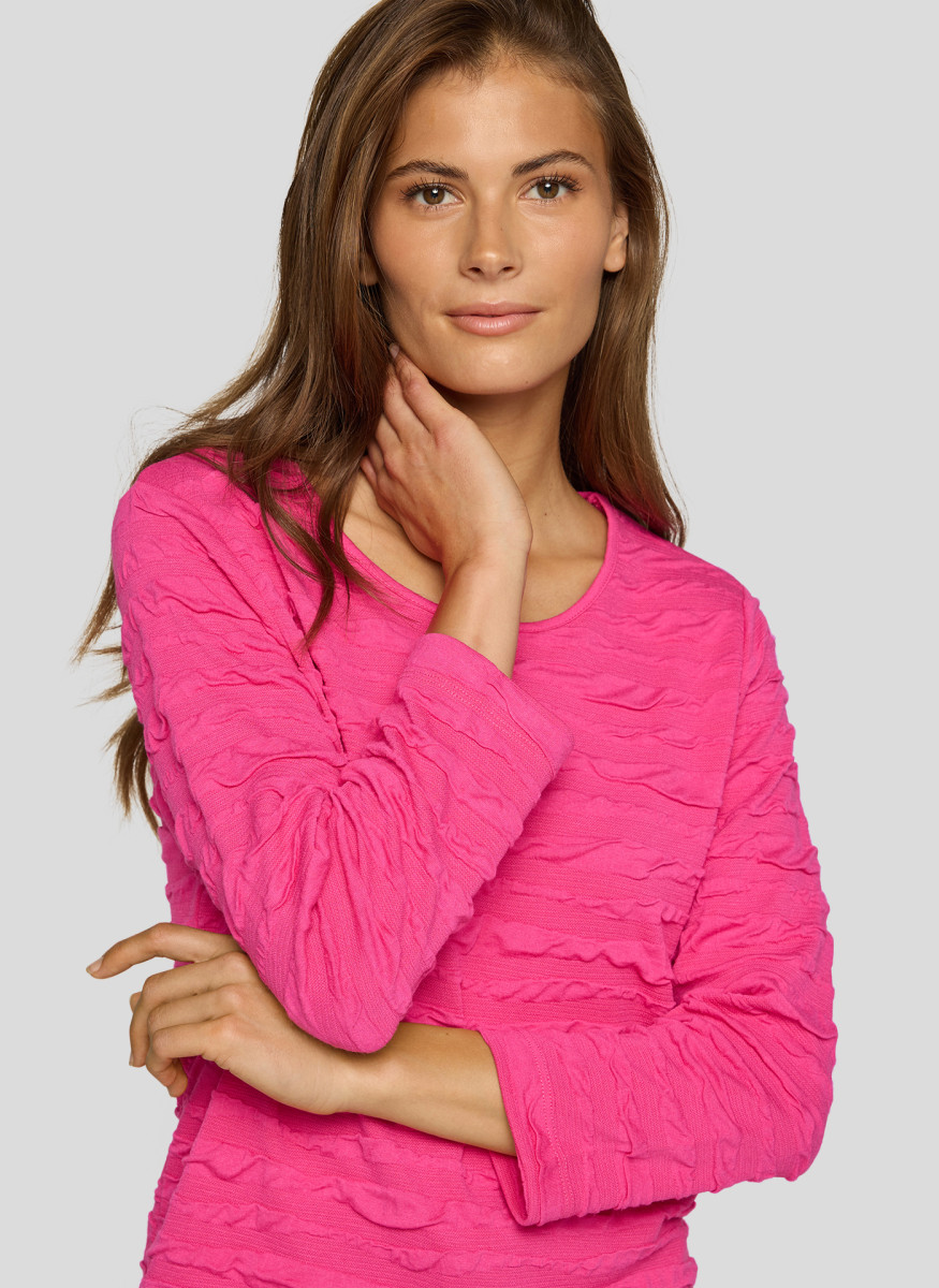 Figurnah geschnittenes Shirt mit lebendiger Struktur aus weichem Jersey. Die gewellte 3D-Optik verleiht dem unifarbenen Design Tiefe und Bewegung. Mit Rundhalsausschnitt und 3/4-Ärmeln ideal für vielseitige Kombinationen _ ob casual oder etwas schicker. Angenehm elastisch und pflegeleicht. Lebendige Wellen-Struktur. Weiche Jersey-Qualität. Figurnahe Passform. Pflegeleichtes Material. 3/4-Ärmel.