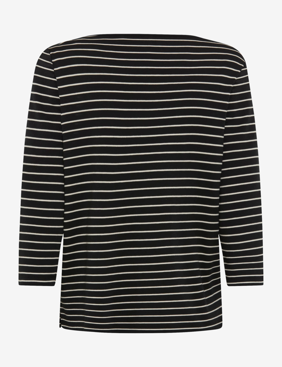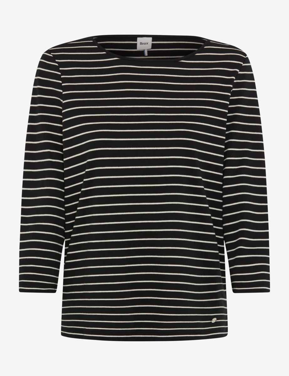 Dieses gestreifte Longsleeve von Brax ist ein zeitloses Basic, das in keinem Kleiderschrank fehlen sollte. Das schwarz-weiße Ringel-Muster verleiht ihm einen maritimen und zugleich klassischen Look. Der weite Rundhalsausschnitt und die 3/4-Ärmel sorgen für eine entspannte und bequeme Passform. Das weiche Material liegt angenehm auf der Haut. Ein kleines, dezentes Logo am Saum rundet das Design ab. Perfekt für den lässigen Alltagslook, lässt sich dieses Oberteil vielseitig zu Jeans, Chinos oder Röcken kombinieren.