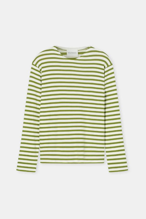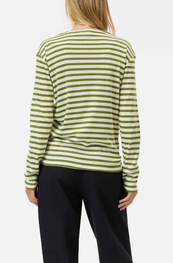 Langarmshirt aus weichem Jersey. Mit feinen eingewebten Streifen, überschnittene Schulter, Rundhalsausschnitt und gerade geschnittener Saum.