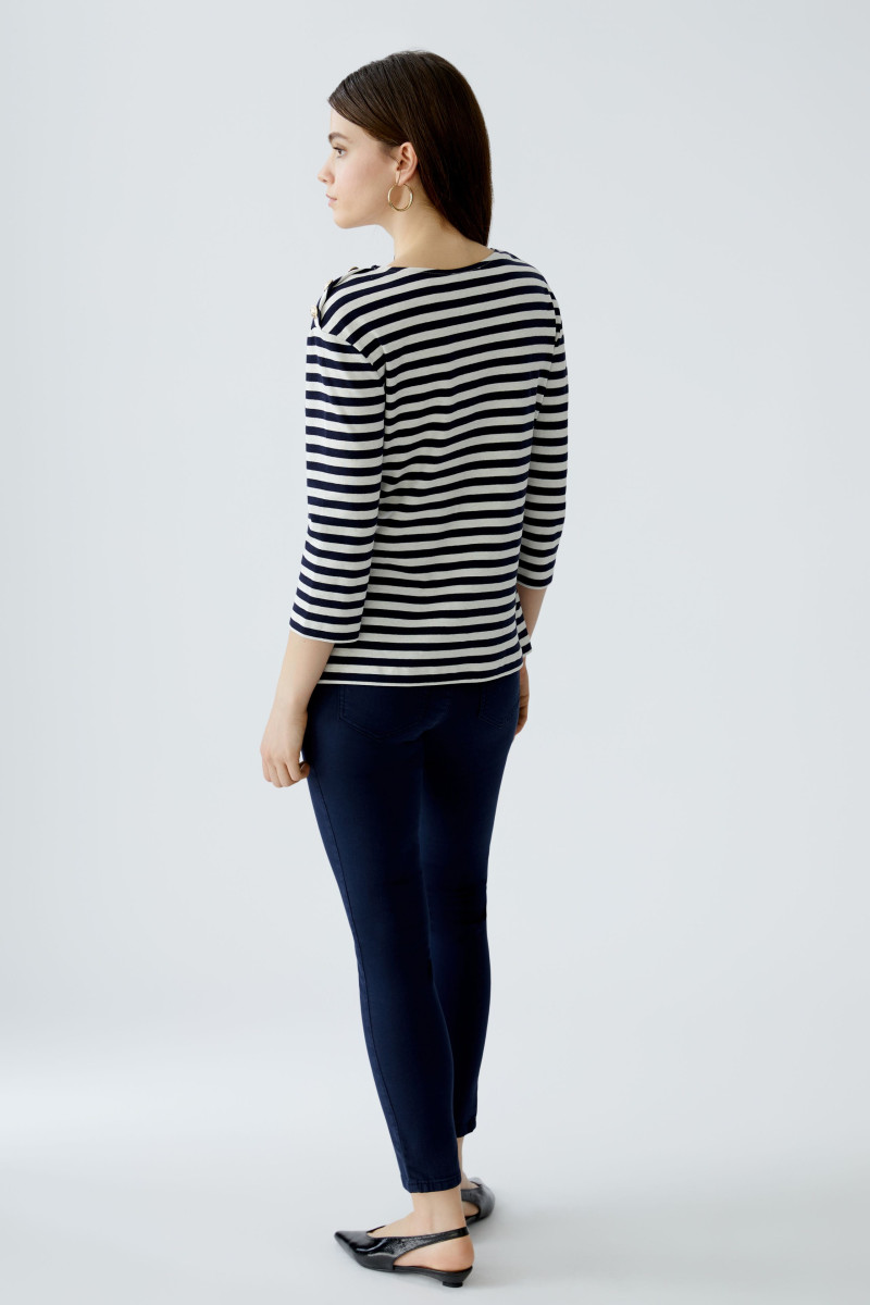 Reine Baumwolle | Interlock Qualität mit eingewirkten Streifen | Gerade geschnitten | Reguläre Länge | Kragenloser U-Boot Ausschnitt | Arm in 3/4 Länge | Dekorative Knöpfe auf der Schulter | Seitliche Schlitze