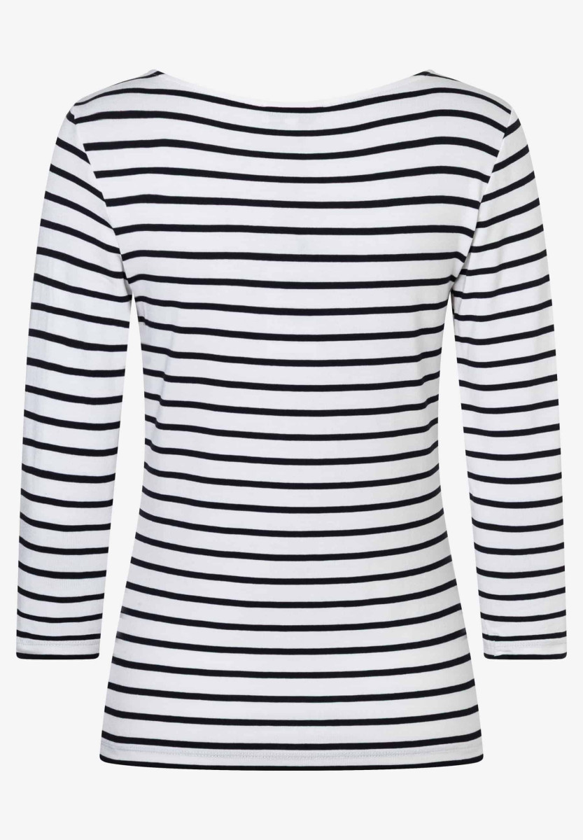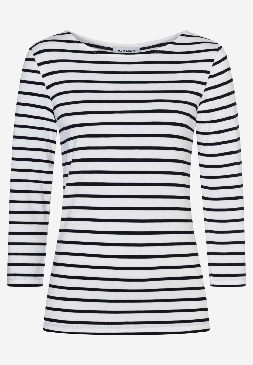Gerade Form | U-Boot Ausschnitt | 3/4 lange Ärmel | Zweifarbiges Streifenmuster | Angenehmer Viskose-Jersey