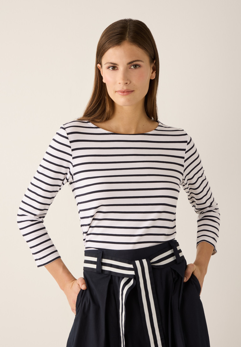 Gerade Form | U-Boot Ausschnitt | 3/4 lange Ärmel | Zweifarbiges Streifenmuster | Angenehmer Viskose-Jersey