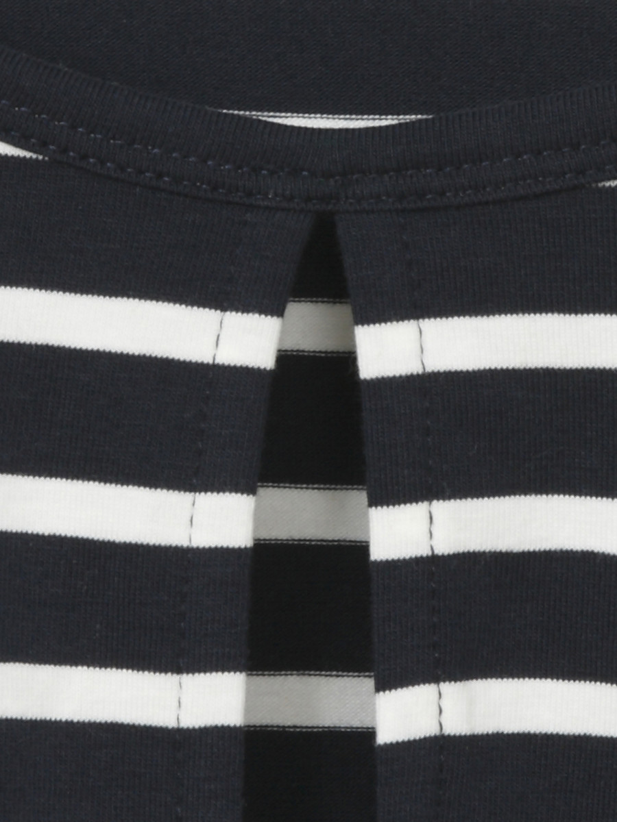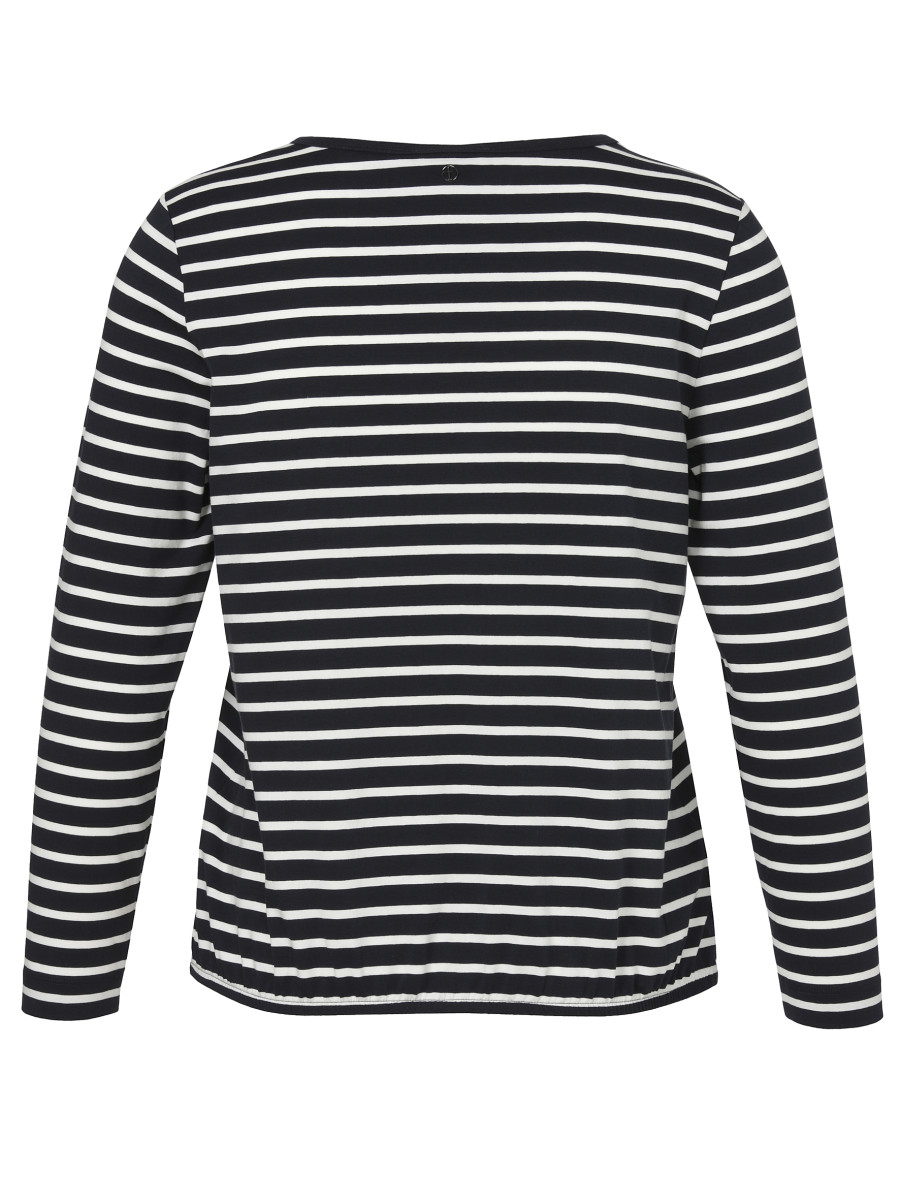 Das Design zeichnet sich durch das klassische, horizontale Streifenmuster aus, das einen unverkennbaren maritimen Charme versprüht. Der Ausschnitt ist als runder Kragen gearbeitet und wird durch einen kleinen Schlitz oder eine dezente Knopfleiste in der Mitte unterbrochen, was dem Shirt eine feminine Note verleiht.
