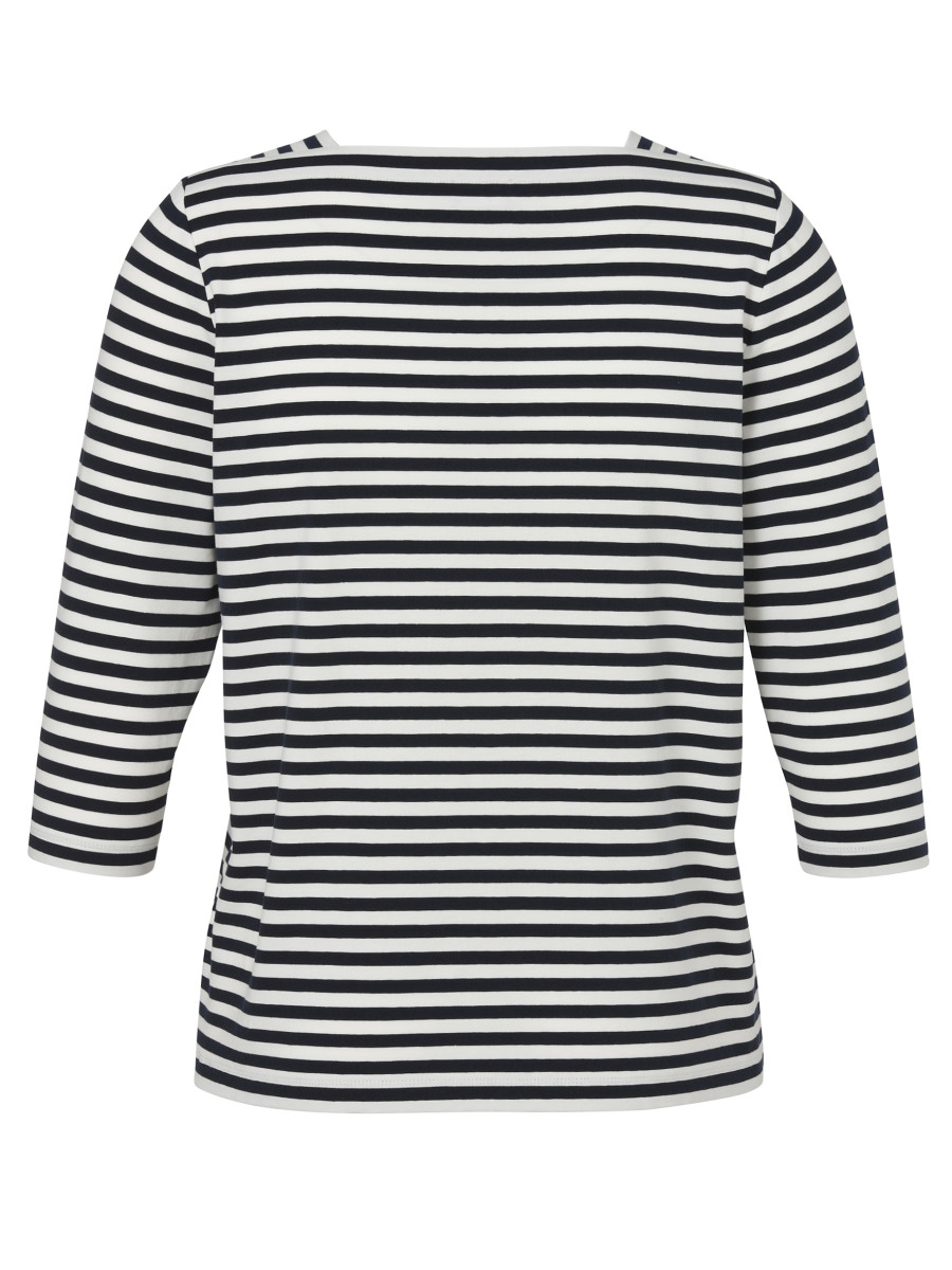 Das Damen T-Shirt überzeugt mit einem Karree-Ausschnitt und 3/4-Ärmeln für eine elegante Silhouette. Das gestreifte Design in klassischer Marine-/Ecru-Kombination macht es zu einem vielseitigen Begleiter im Alltag und lässt sich leicht zu verschiedenen Looks kombinieren. Der Schnitt bietet einen angenehmen Sitz und sorgt für unkomplizierte Styling-Optionen von Freizeit bis Büro.Lief.-Art-Nr: 2621410