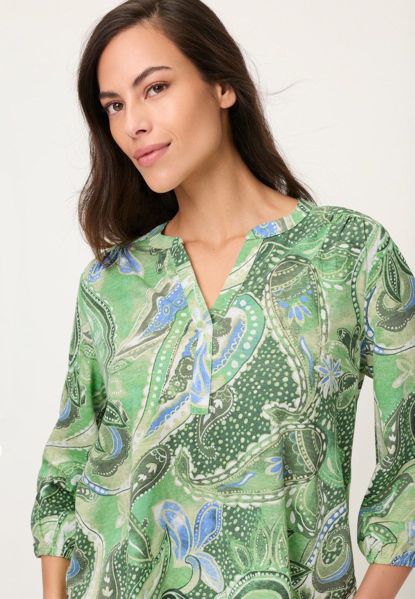 Dieses Shirt bringt mit seinem modernen Allover-Dessin frische Dynamik in den Look. Der tunikaartige Ausschnitt verleiht dem Design eine feminine, lässige Note, während die 3/4-Ärmel für eine ausgewogene Silhouette sorgen. Gefertigt aus reiner Baumwolle überzeugt das Shirt mit einem angenehmen Tragegefühl und natürlichem Komfort – ideal für vielseitige Everyday-Outfits.