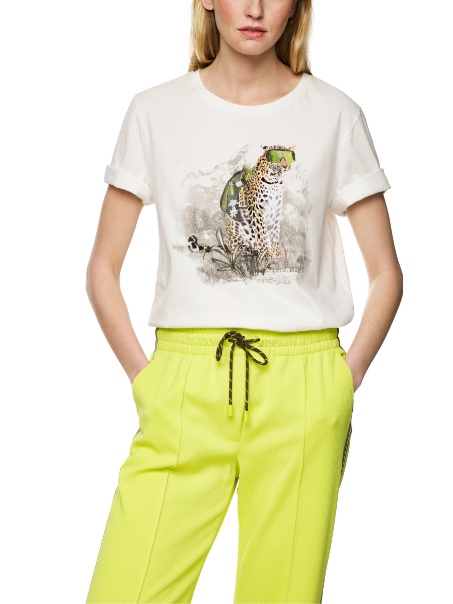 T-Shirt mit Wander-Leo | Perfekt für alle Wander-Fans! Das klassische T-Shirt hat einen Druck mit einem Leoparden beim Wandern. Ausgestattet mit Rucksack, Thermoflasche und Sonnenbrille, macht er in der Berglandschaft eine gute Figur. Die verliebten Details des Drucks sind mit Perlen und Pailletten hervorgehoben. Die Passform ist gerade, mit einem weiten Ärmel. Gerade Passform | Kurzarm | 100% Baumwolle | Leo-Druck | Das Model ist 179 cm groß und trägt N3/38.
