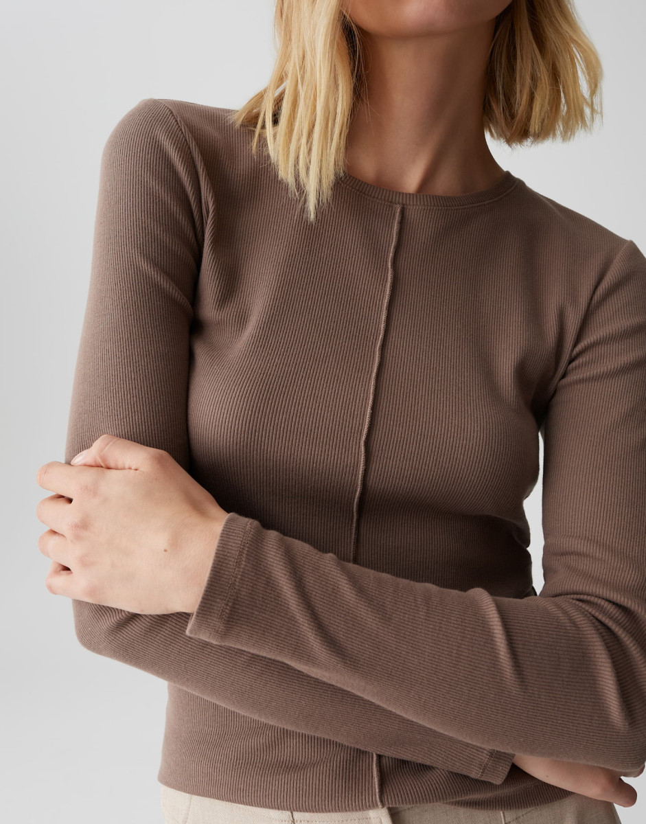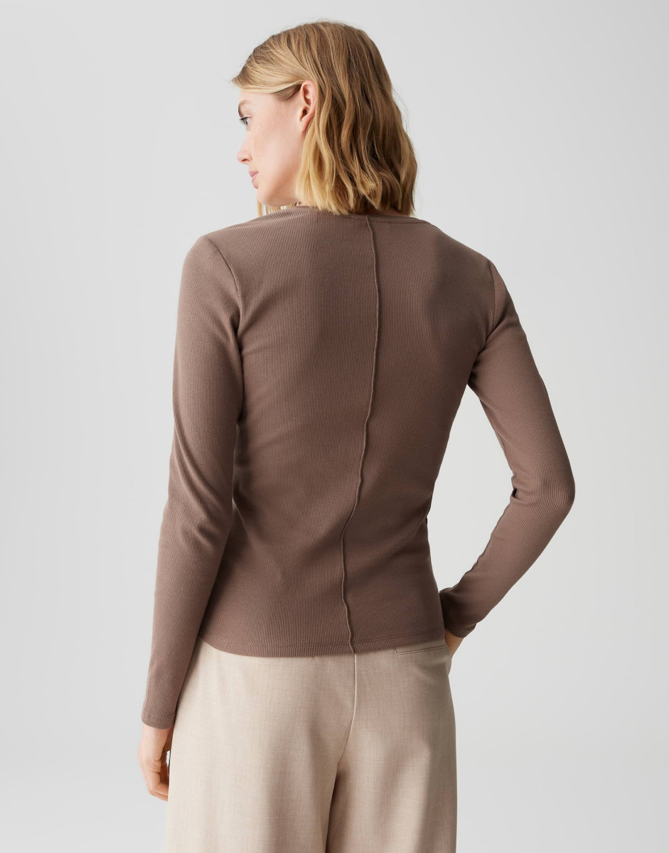 Hergestellt aus einem weichen, elastischen Jersey-Stoff mit feiner Rippstruktur, bietet das Shirt einen angenehm weichen Griff und passt sich jeder Bewegung an. Der klassische Rundhalsausschnitt und die normale Länge machen es zu einem vielseitigen Allrounder für jeden Tag. Besondere Akzente setzen die feinen Längsnähte auf der Vorder- und Rückseite, die dem Design eine moderne, figurbetonende Note verleihen.