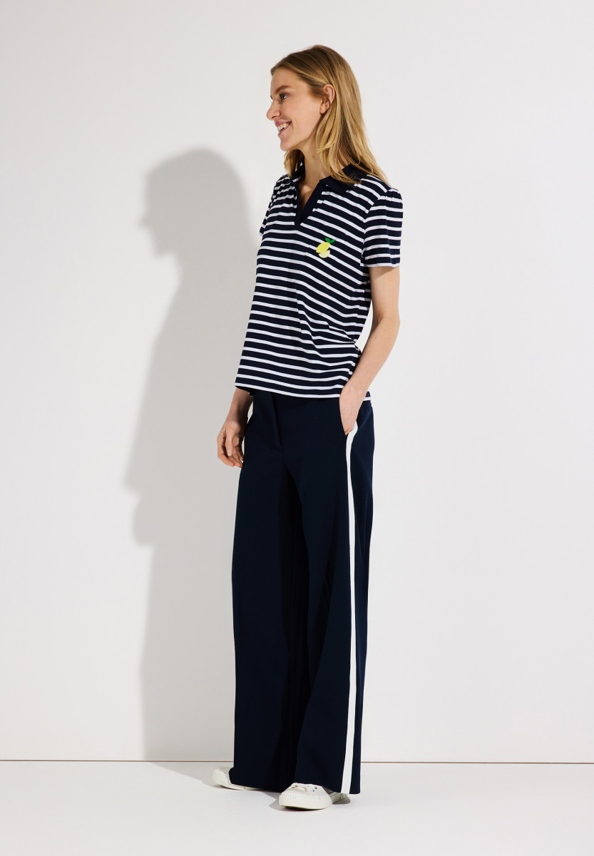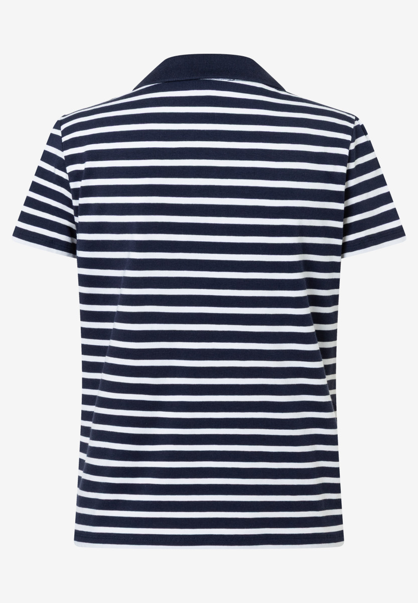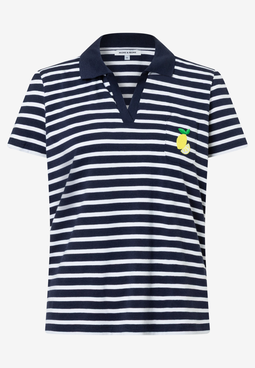 Maritimer Vibe trifft auf frische Details: Dieses gestreifte Poloshirt von MORE & MORE in Marine und Weiß ist perfekt für entspannte Everyday-Looks. Der klassische Kragen verleiht dem Style eine sportliche Note, während das kleine Zitronen-Stickdetail auf der Brusttasche für einen verspielten, sommerlichen Twist sorgt. Dank softer Qualität und bequemer Passform wird es schnell zum Lieblingspiece – perfekt zu Denim, Chinos oder Shorts.Lief.-Art-Nr: 61030008