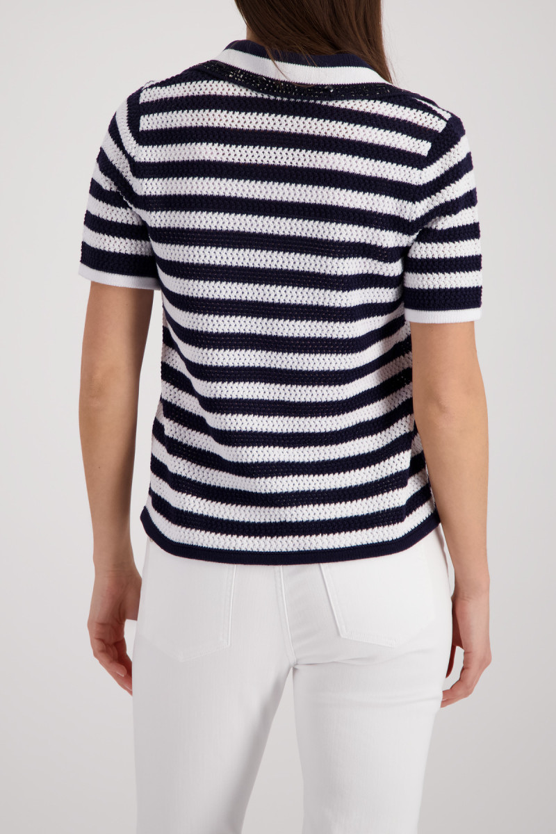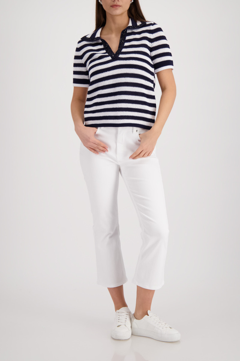 Eleganter Ajour-Polo-Pullover aus 100% Baumwolle, verziert mit Streifen und funkelnden Strasssteinen.