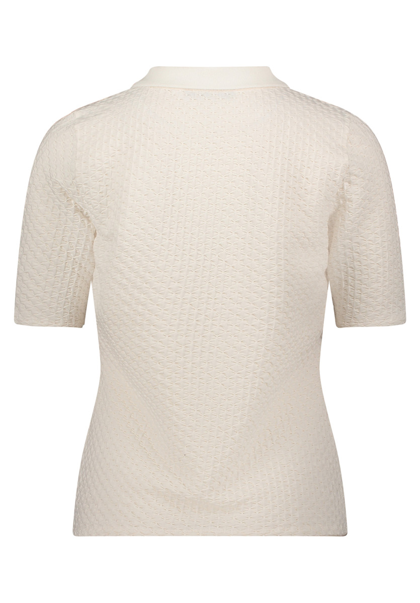 Dieser taillierte Halbarm-Polopullover aus weichem Jersey bietet die ideale Kombination aus femininem Schnitt und sportlicher Eleganz. Dank der figurbetonten Passform schmiegt sich das Oberteil angenehm an die Silhouette an, während das hochwertige Jersey-Material für ein besonders elastisches und komfortables Tragegefühl sorgt. Mit einer Gesamtlänge von 62 cm schließt das Modell optimal an der Hüfte ab, was es zu einem vielseitigen Partner für High-Waist-Hosen oder klassische Röcke macht.