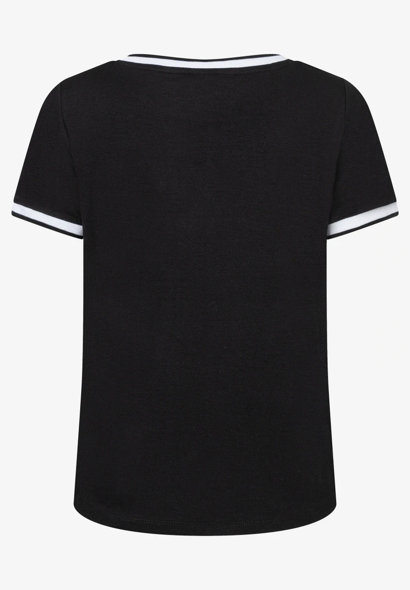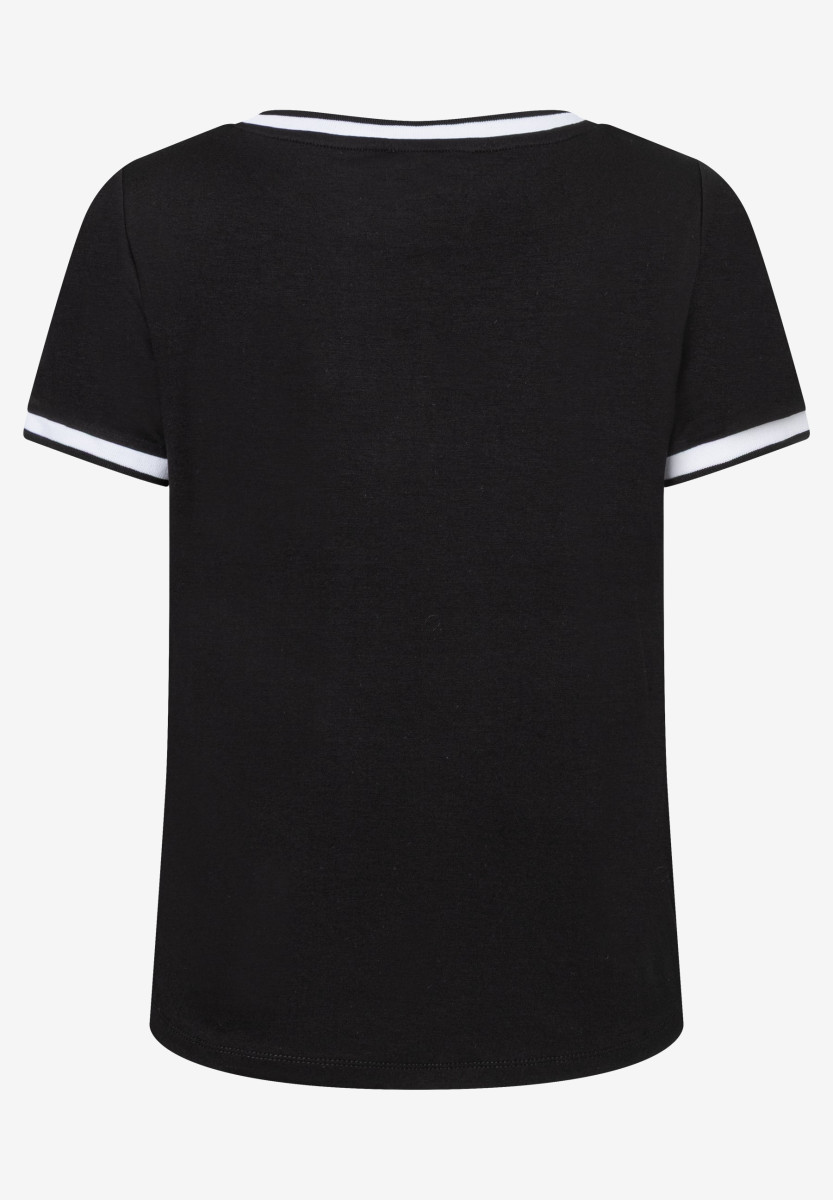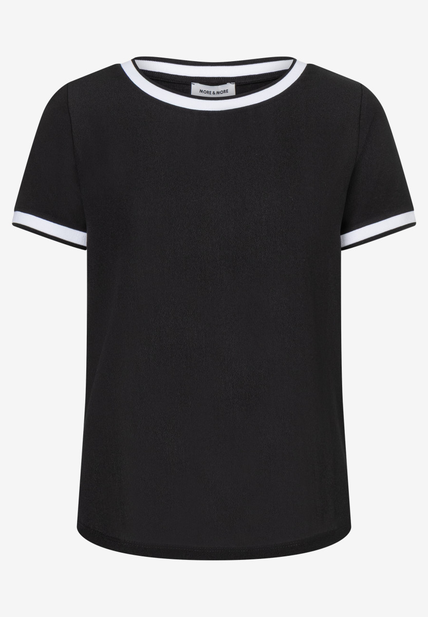Gerade Form | Runder Ausschnitt | Kurze Ärmel | Kontrastfarbige Abschlüsse an Ausschnitt und Ärmelsaum | Front aus fließender Webware | Rücken und Ärmel aus softem Jersey